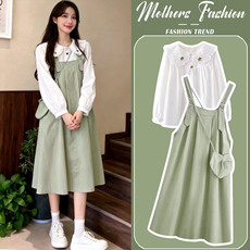 孕妇连衣裙套装春秋2026新款韩版潮妈绿色不显怀背带裙上衣两件套