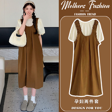 孕妇套装圆领短袖薄款上衣韩版时尚宽松背带裙两件套2026新款夏季