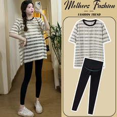 孕妇套装夏季2026新款宽松杏色条纹薄款短袖百搭显瘦上衣女两件套