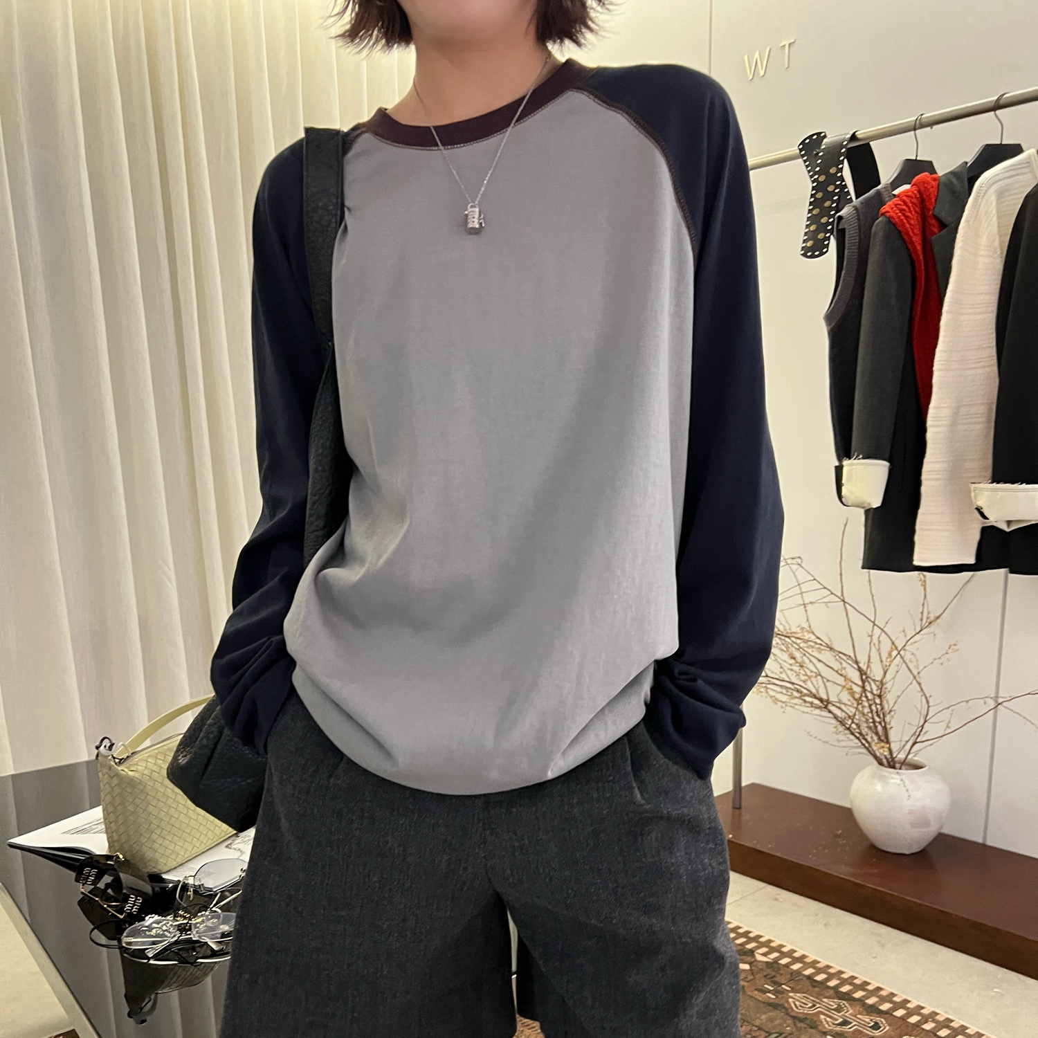 超具韩味!韩版休闲显瘦插肩袖T恤 洋气拼接撞色宽松长袖打底衫女