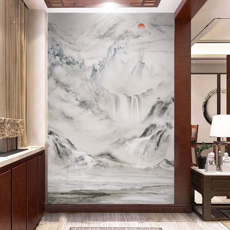 壁纸定制3d中式山水玄关背景墙壁纸别墅挑高复式壁布客厅墙布壁画