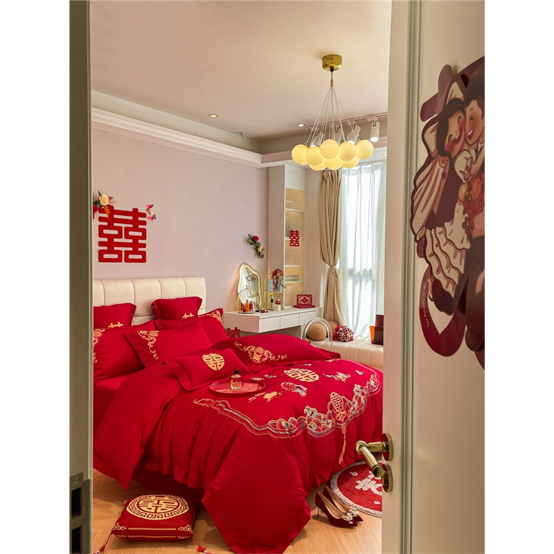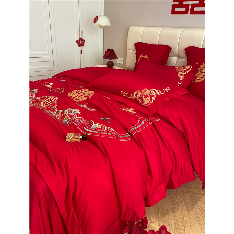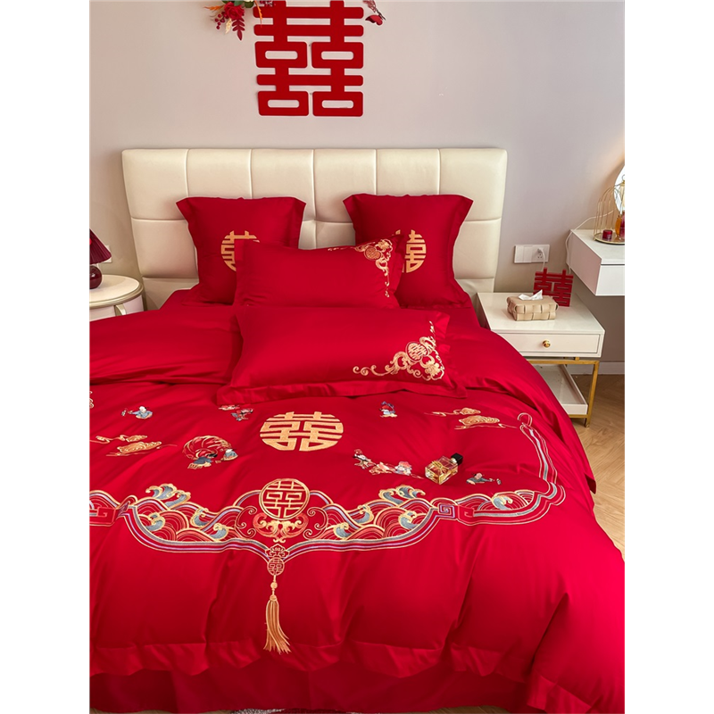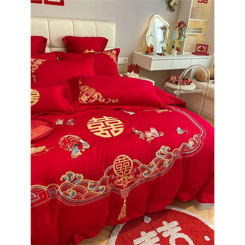 高档中式百子图刺绣结婚四件套红色床单被套纯棉喜被婚庆床上用品