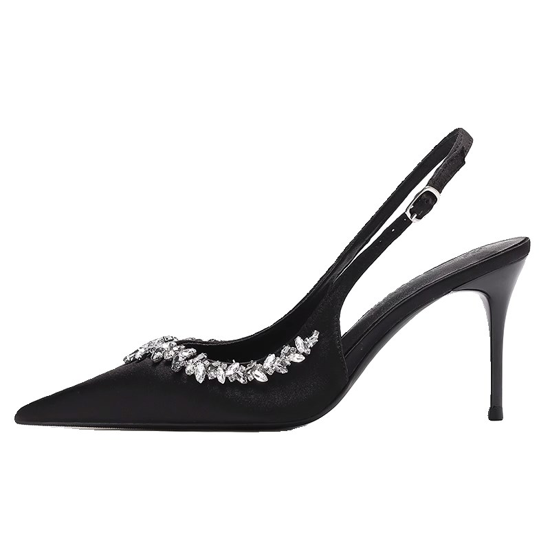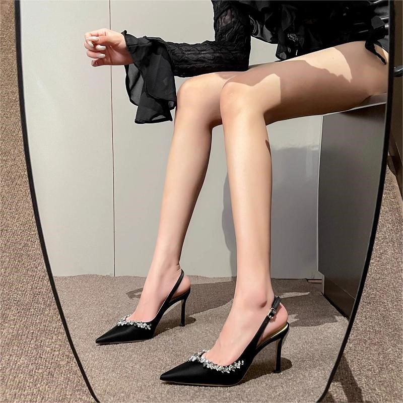 法式气质尖头黑色高跟鞋2024新款小众设计感水钻细跟凉鞋女不累脚