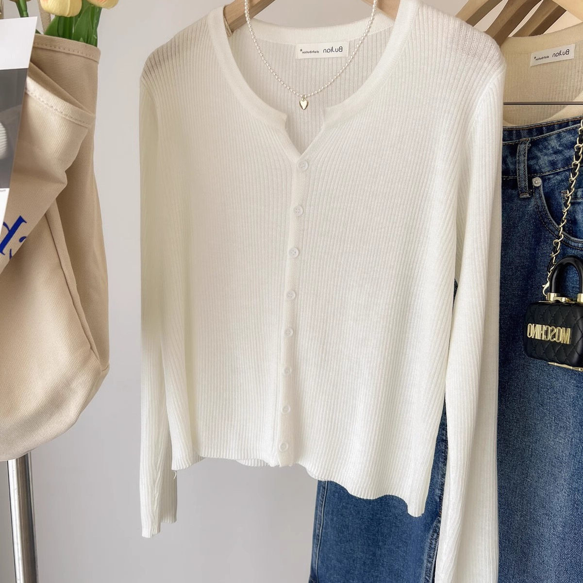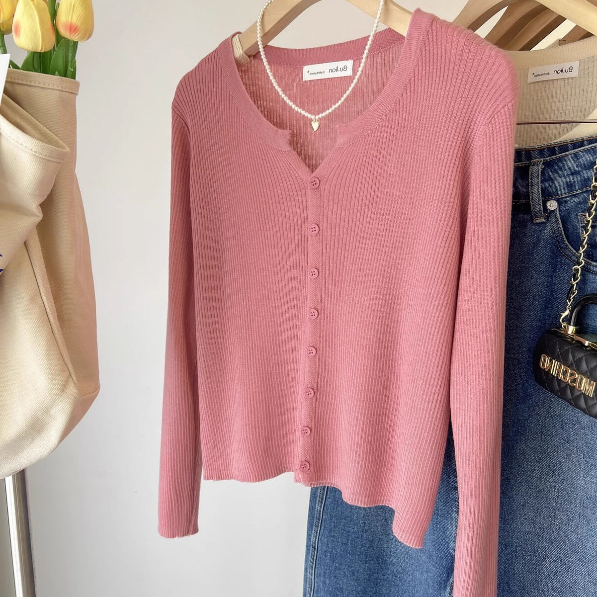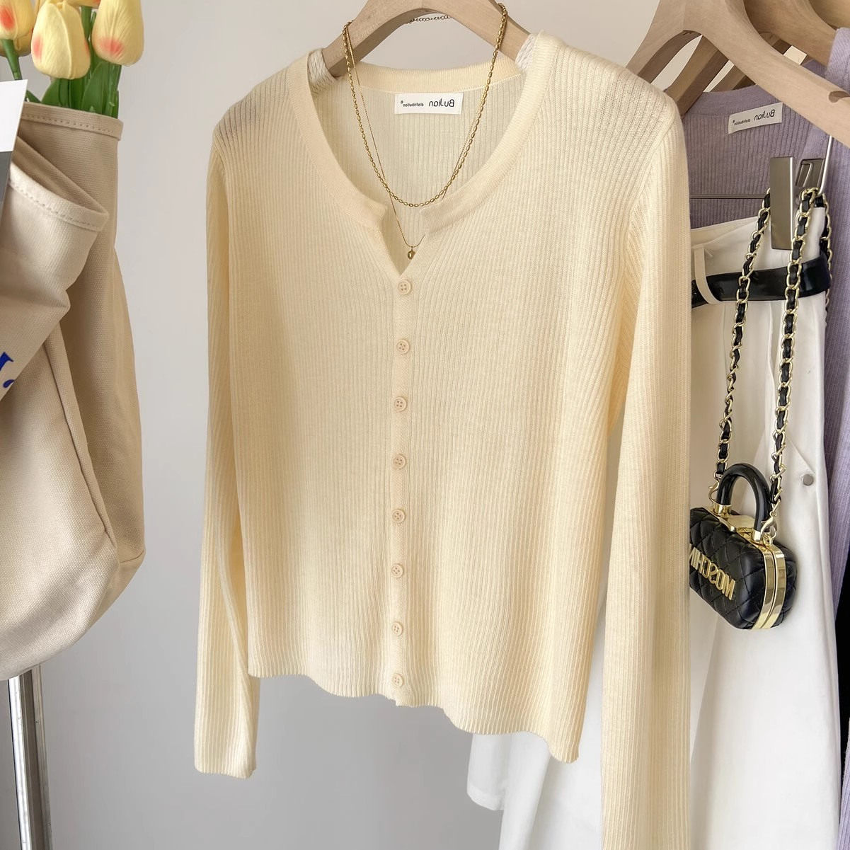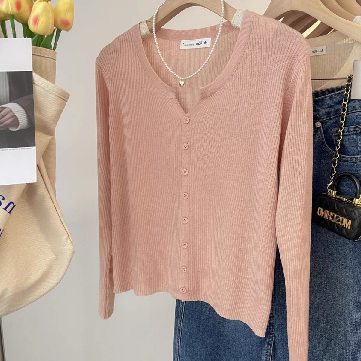 正肩奶蓝色短款针织外套女早秋长袖开衫薄款小香风内搭打底衫上衣