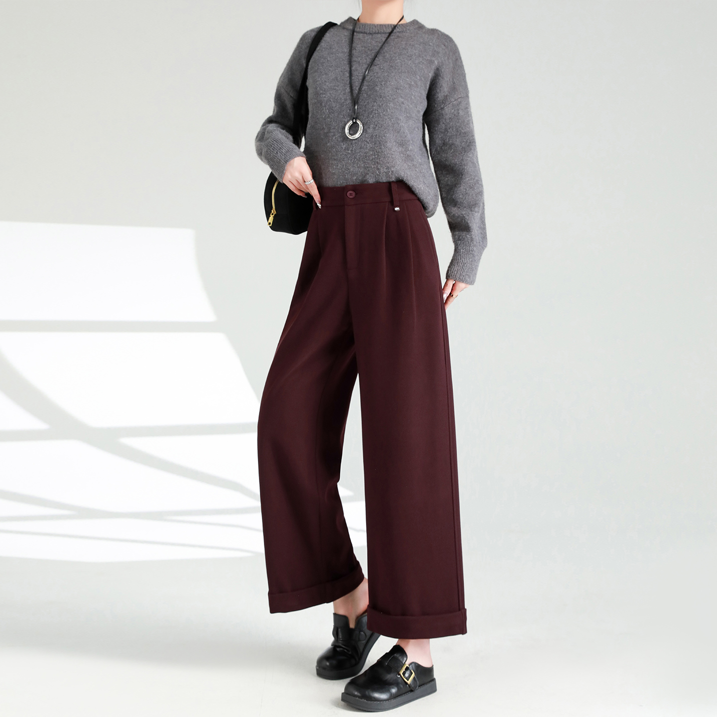 休闲毛呢阔腿裤女秋冬高腰宽松显瘦加厚葡萄紫小个子九分直筒裤子