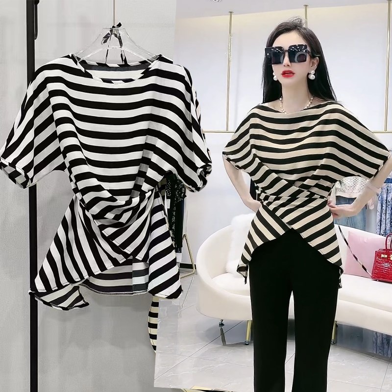 衬衫女2023夏季新款设计感交叉绑带气质不规则一字领条纹雪纺上衣