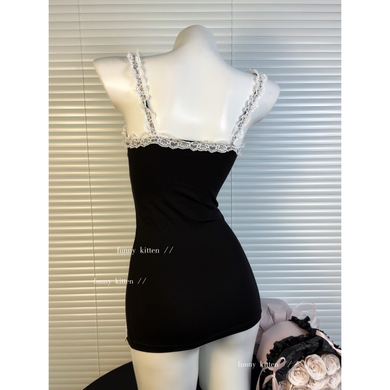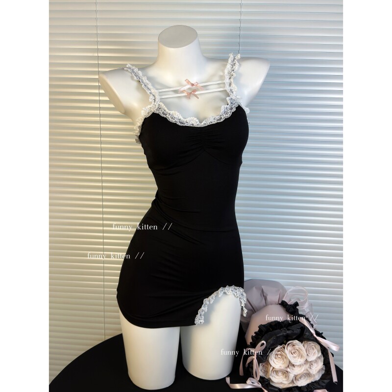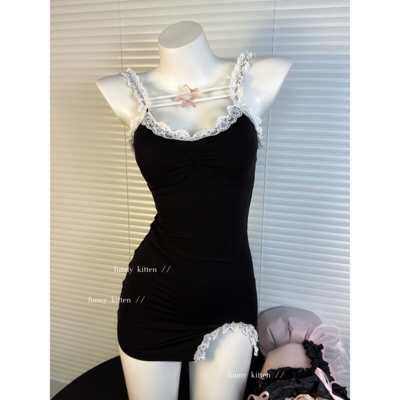 funny kitten奶油泡芙蕾丝性感睡裙女带胸垫黑色开叉纯欲包臀裙