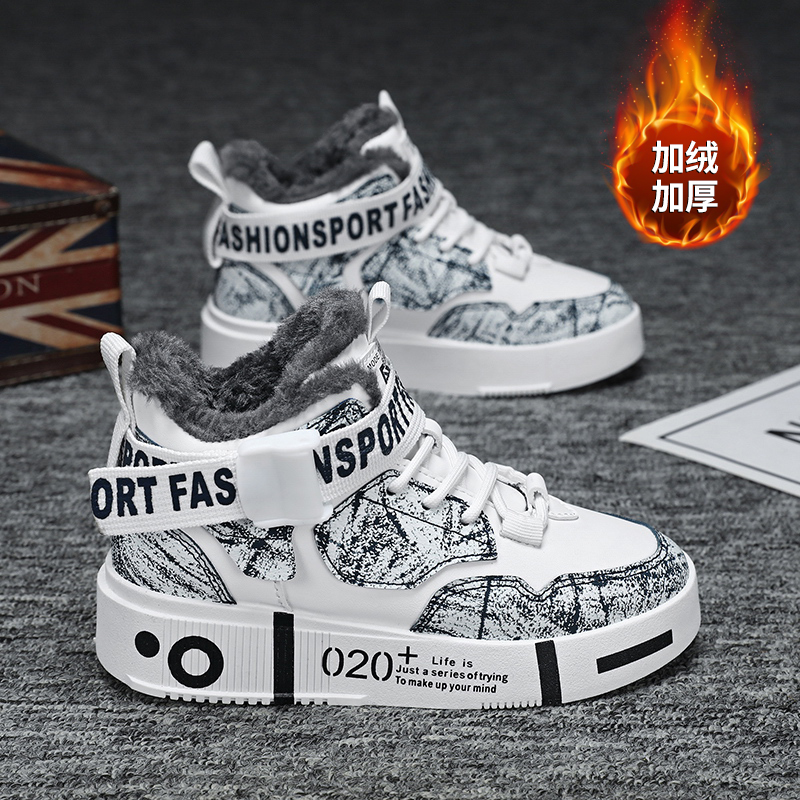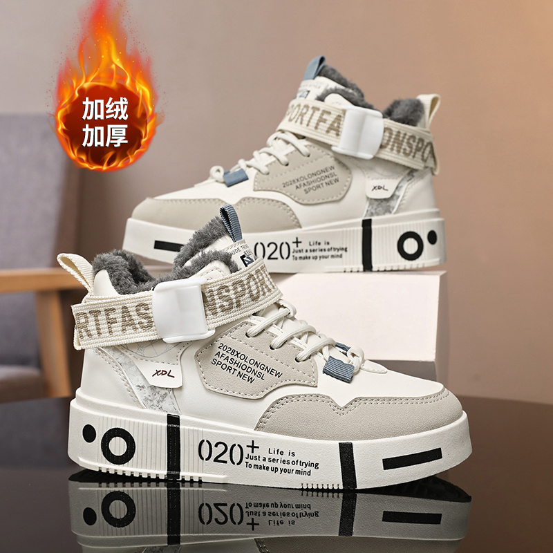 冬季儿童棉鞋男童高帮运动鞋皮面中大童40码42青少年加绒加厚板鞋