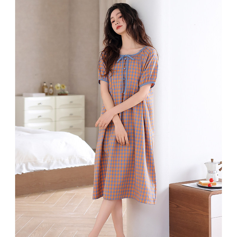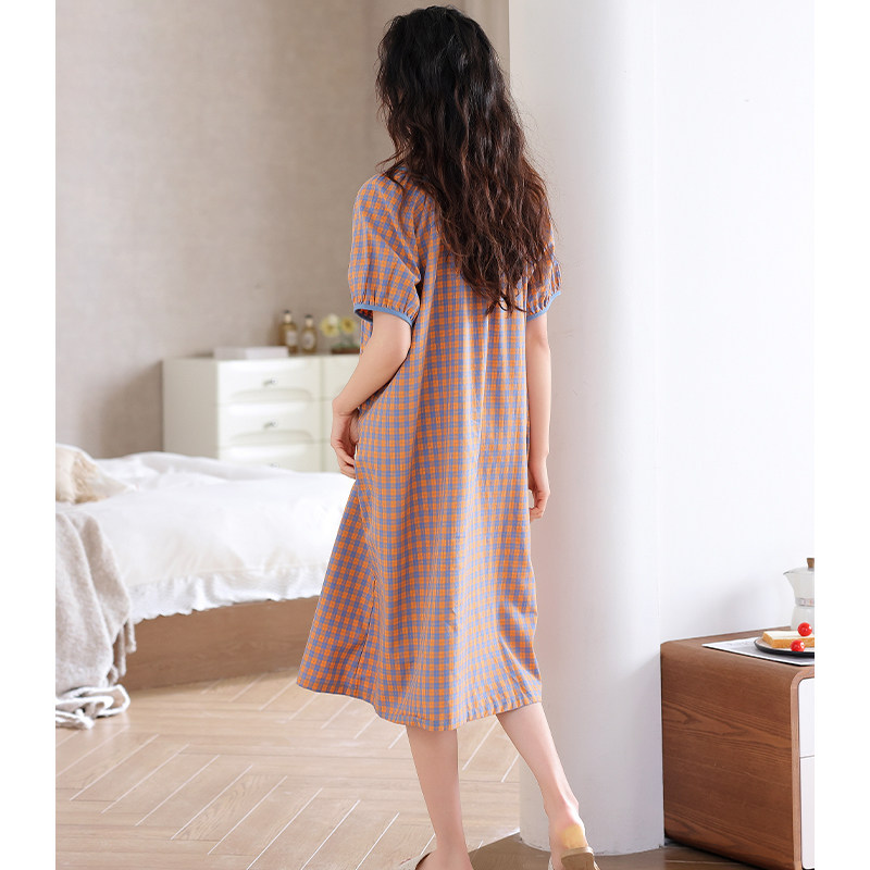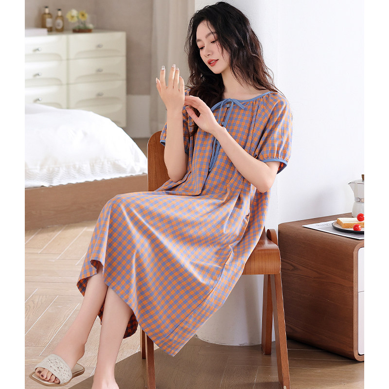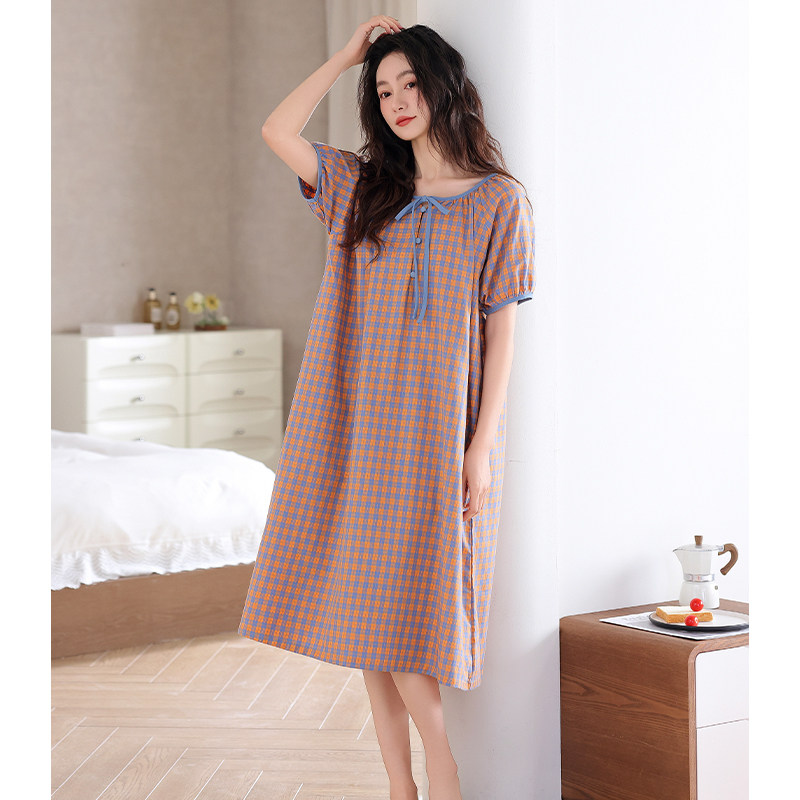 猫人带胸垫睡裙女夏季纯棉短袖梭织全棉格子宽松大码孕妇家居服夏