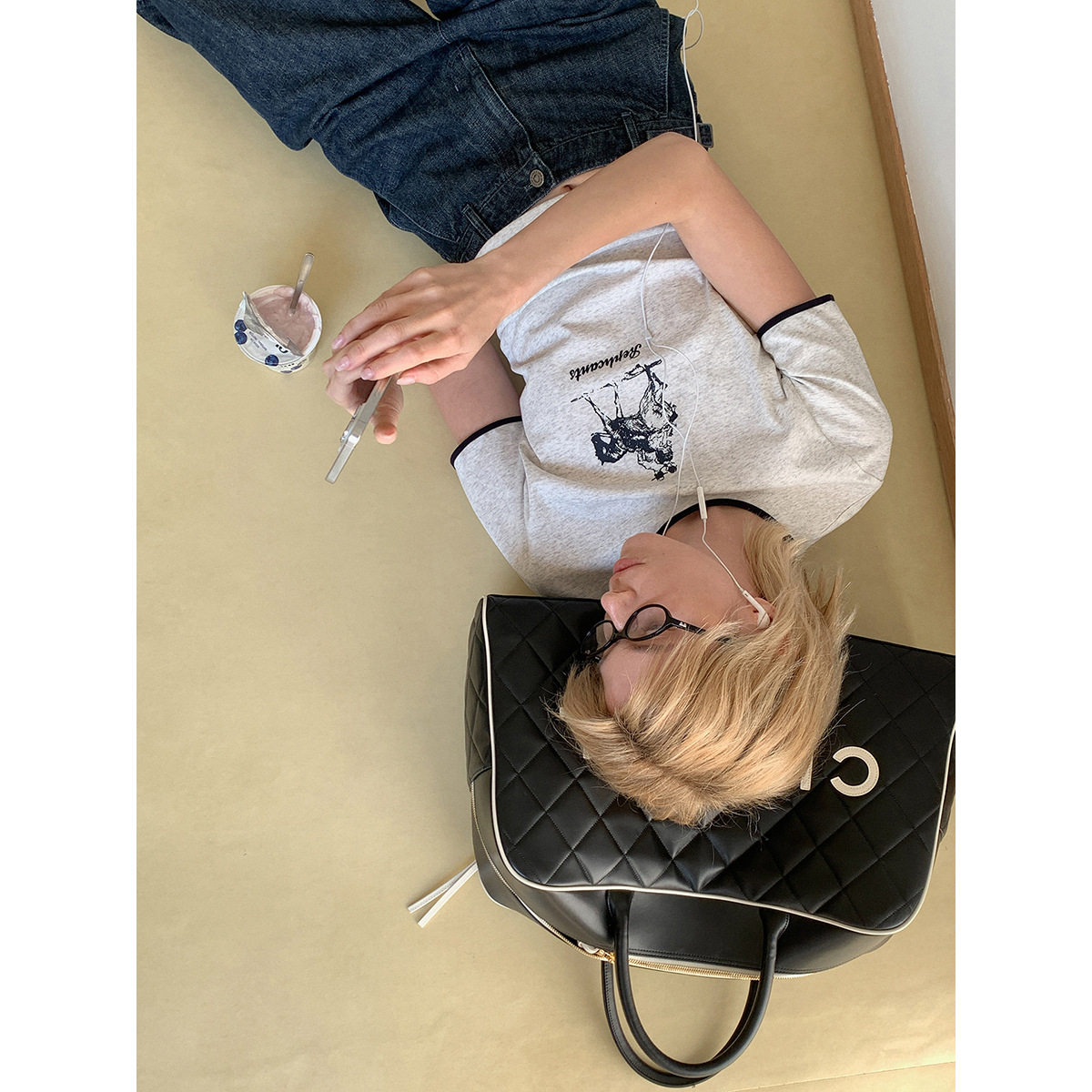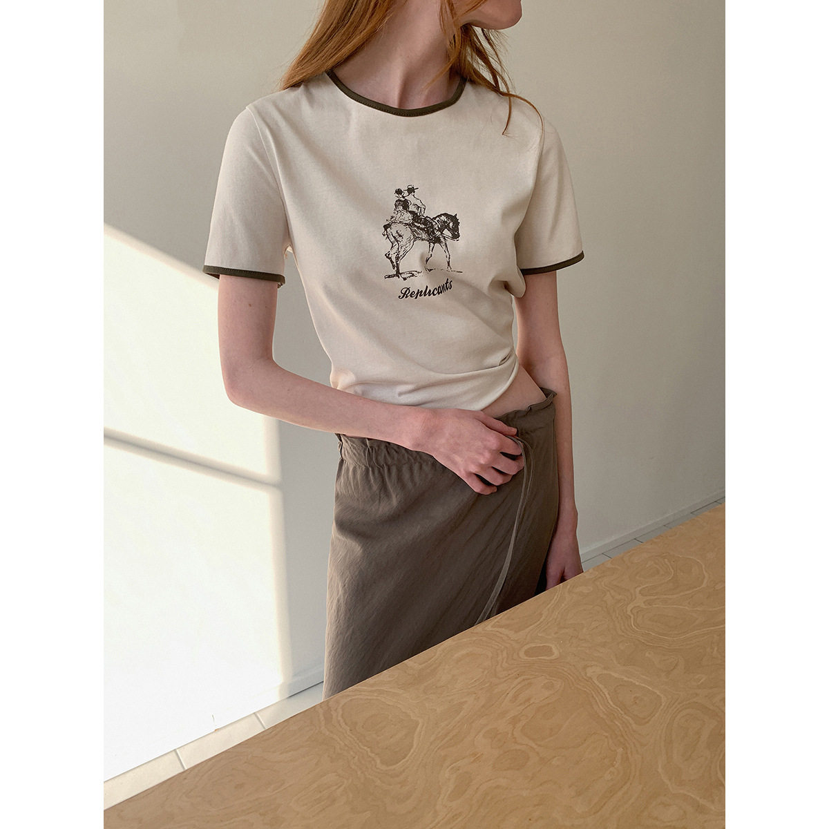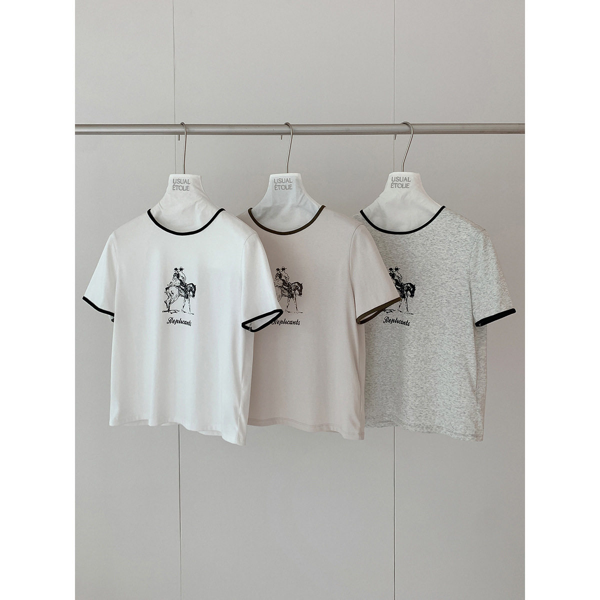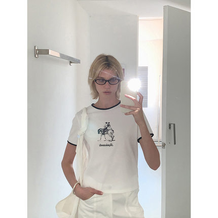 DT 春季焕新 艺术印花圆领撞色短袖T恤女春季新款索罗娜混纺上衣