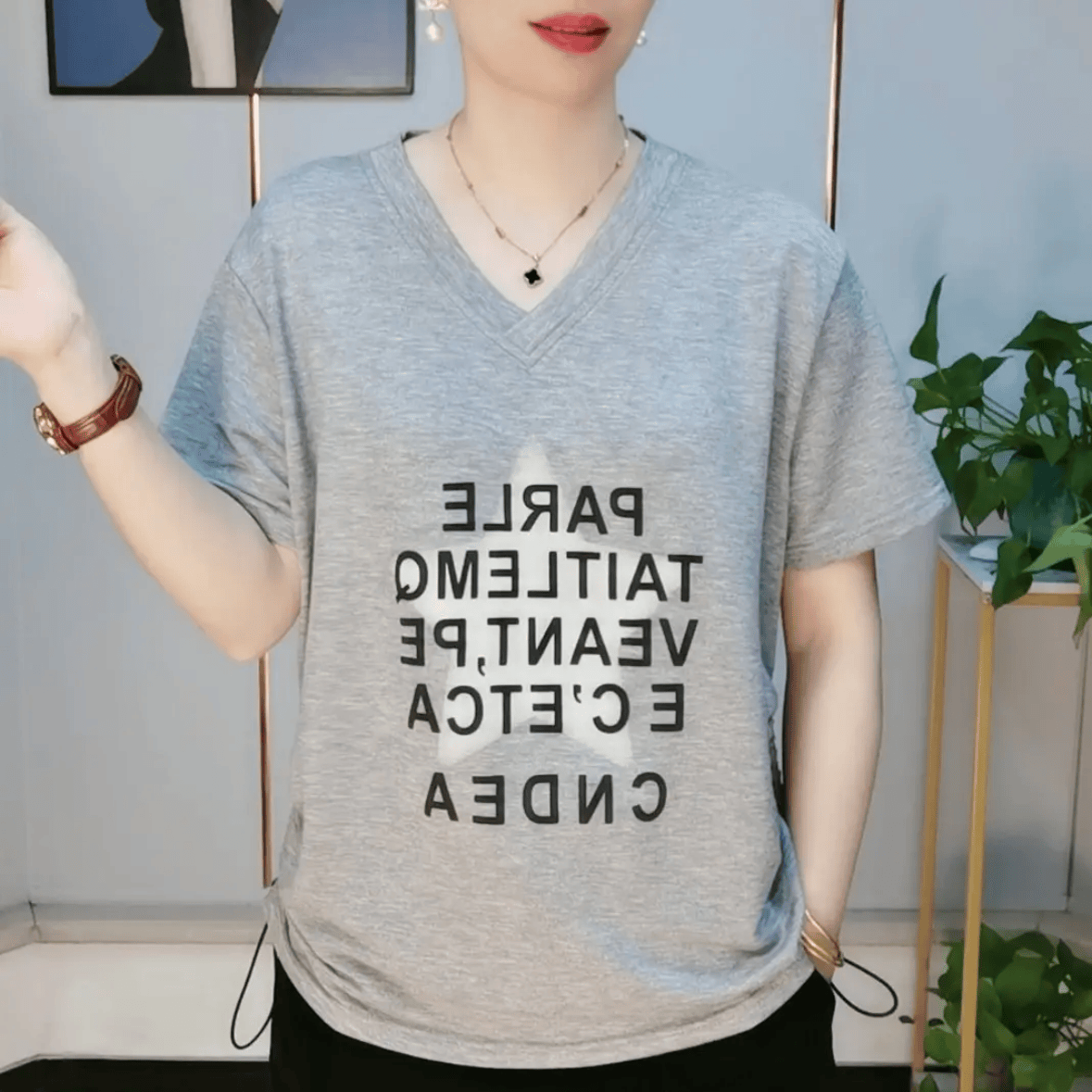 夏季新款大码女装宽松显瘦短袖t恤立体印花V领条纹上衣休闲T恤衫