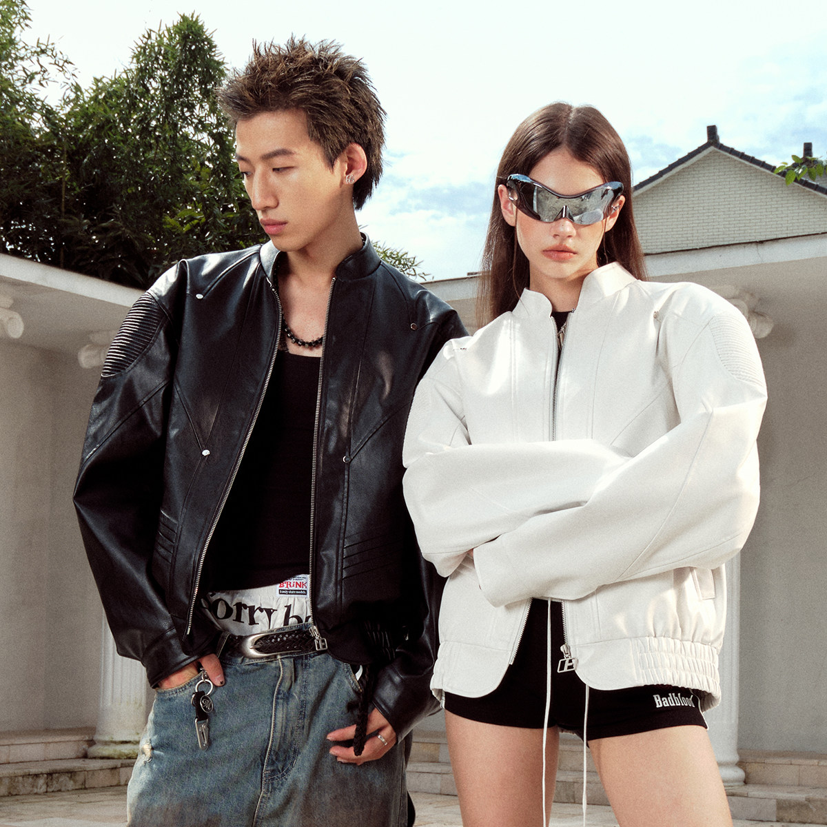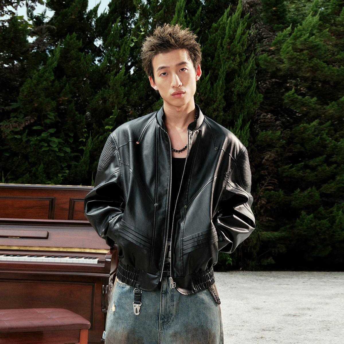FORNINES高品质pu皮短款垫肩皮衣男女潮牌机车服春秋美式夹克外套