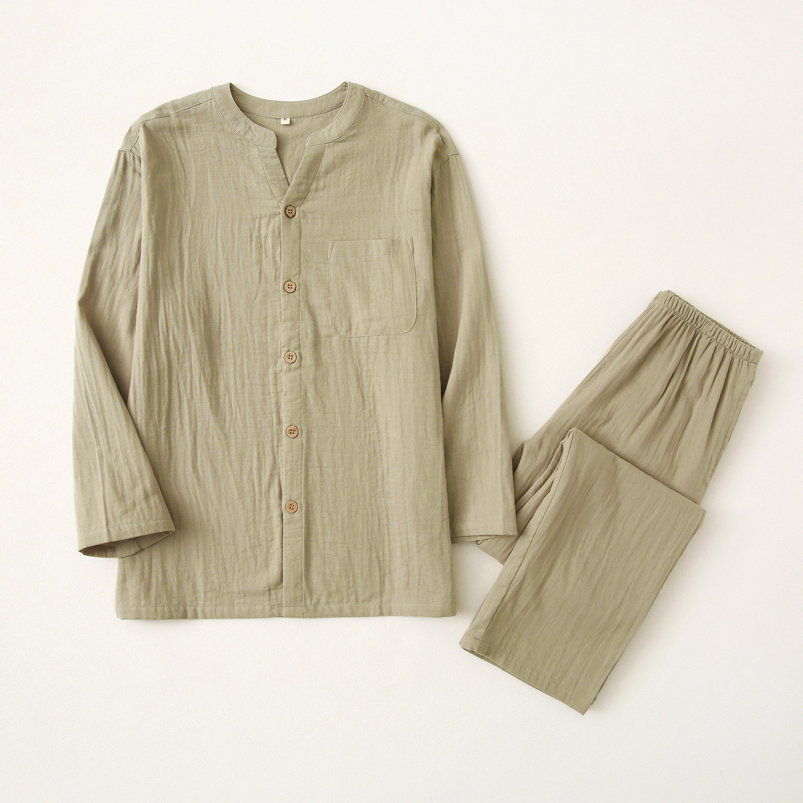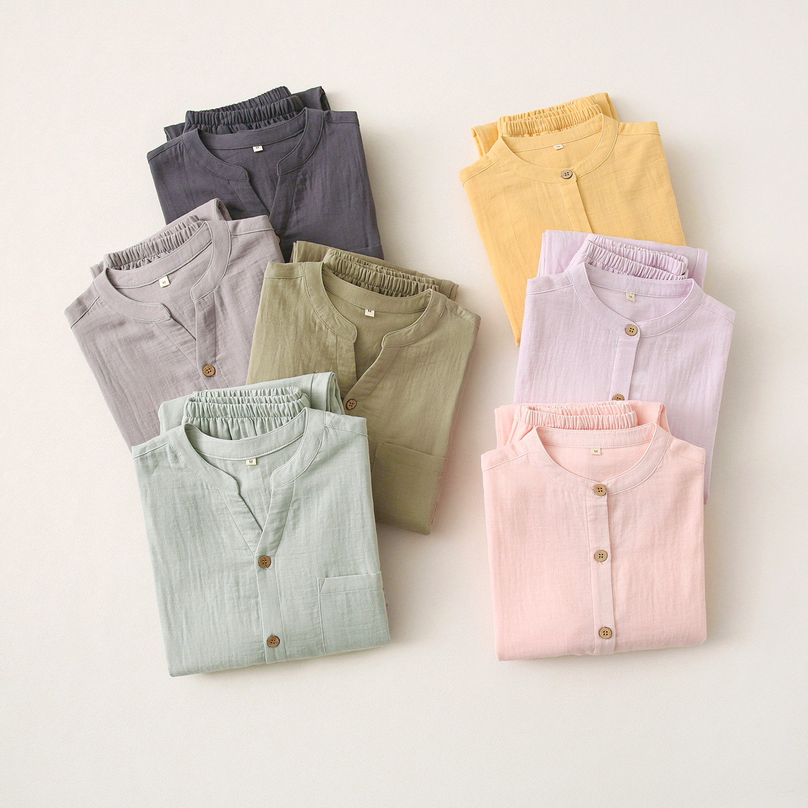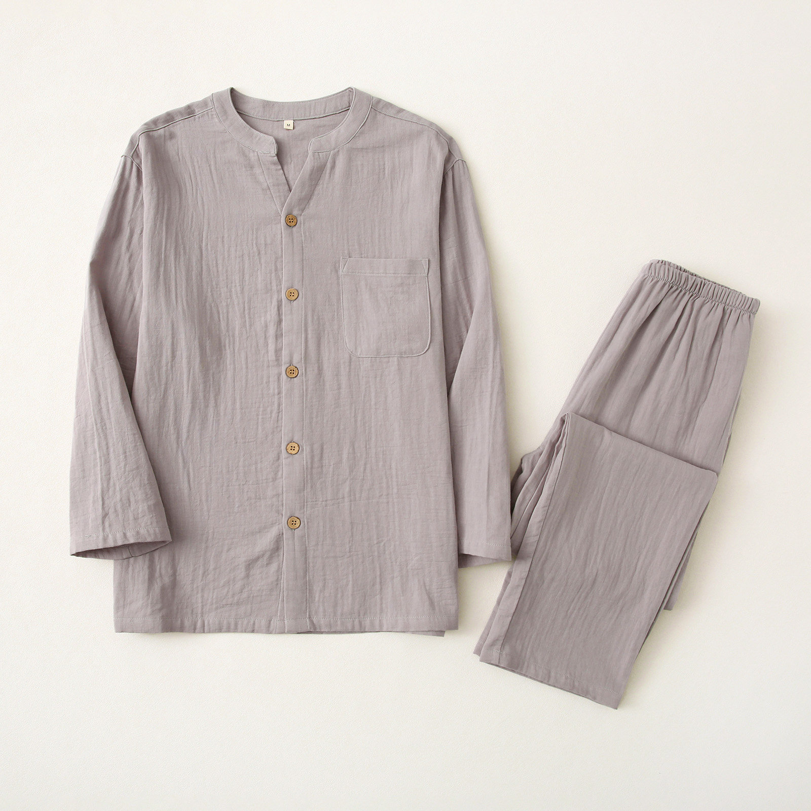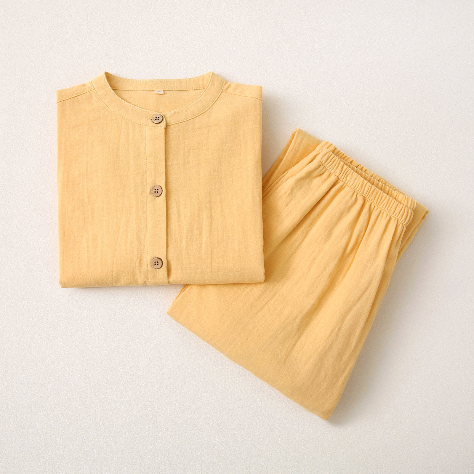 水洗棉全棉双层纱布睡衣套装男女情侣款春夏日系圆领家居服有裤兜