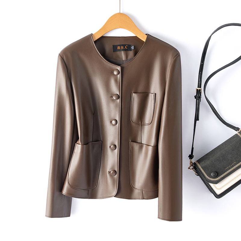 春秋新款海宁真皮皮衣女士短款圆领皮夹克韩版修身显瘦绵羊皮外套