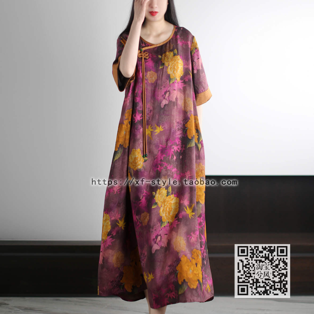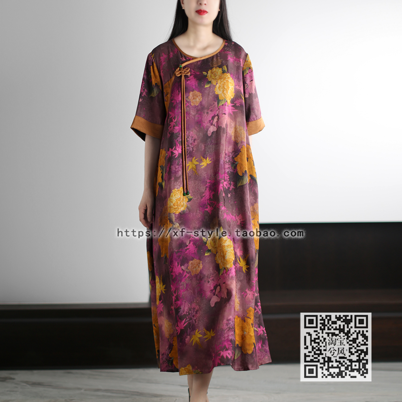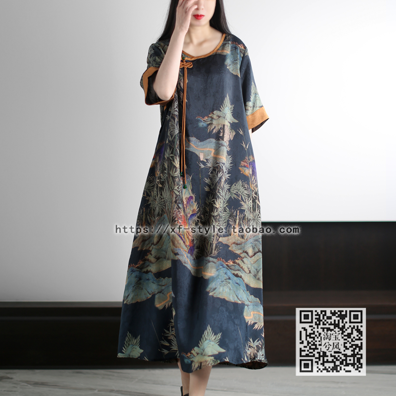 兮风典雅文艺范人丝提花香云纱连衣裙圆领中袖印花斜襟长袍子夏季