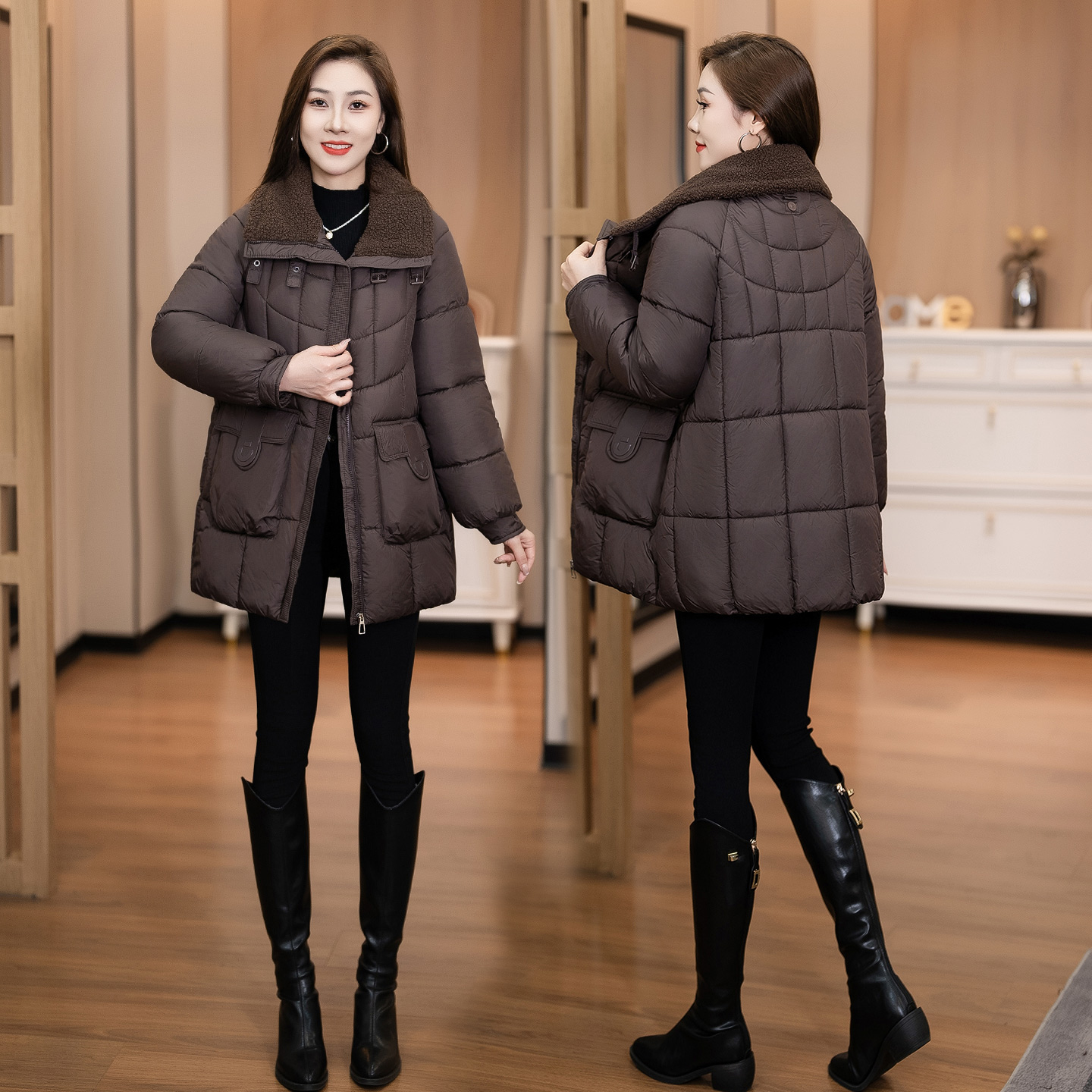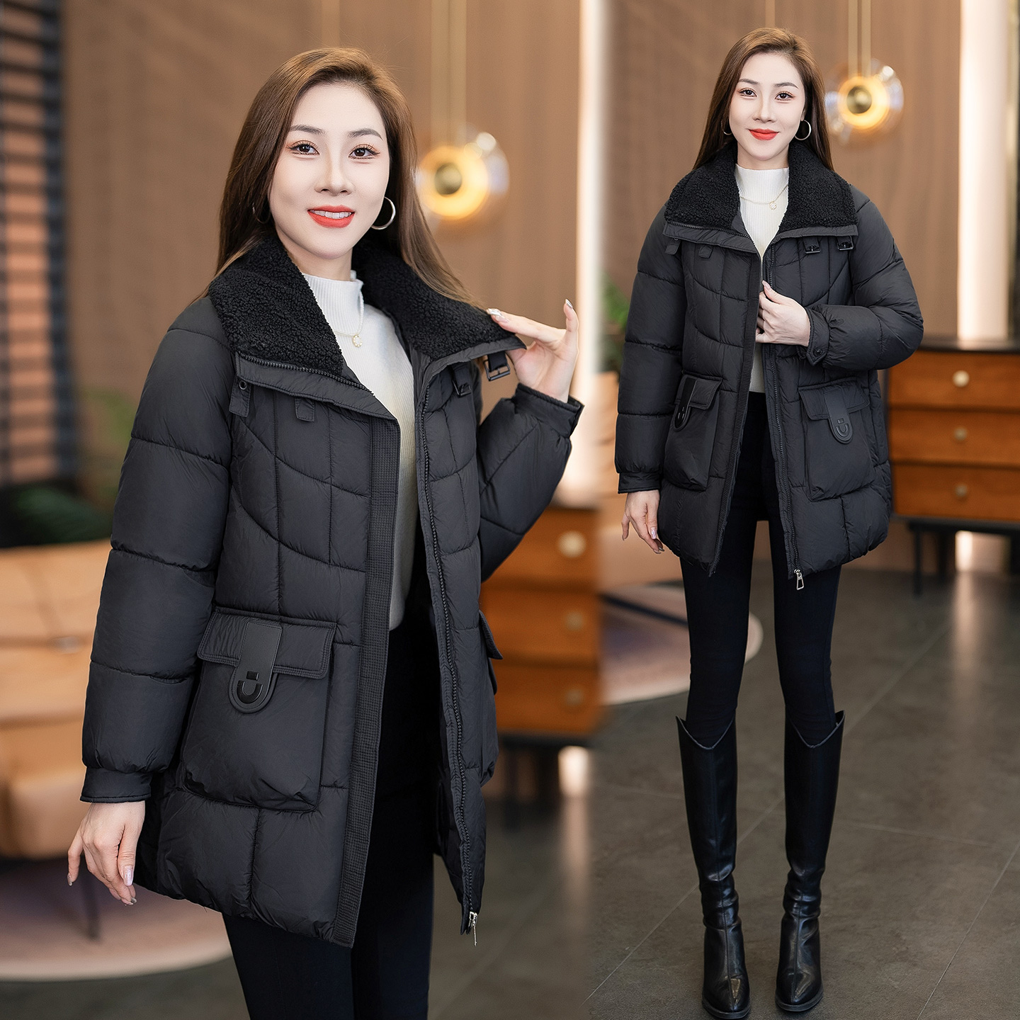冬季新款韩版宽松显瘦羊羔毛翻领中长款棉衣女士加厚保暖棉服外套