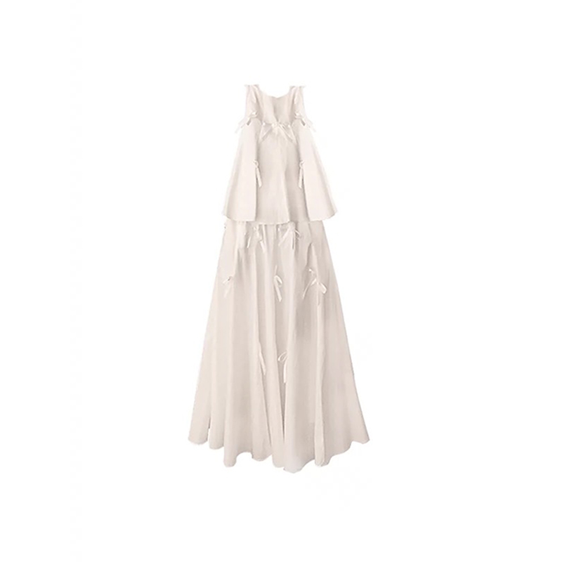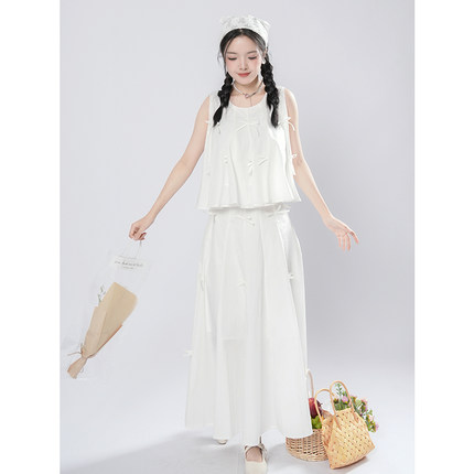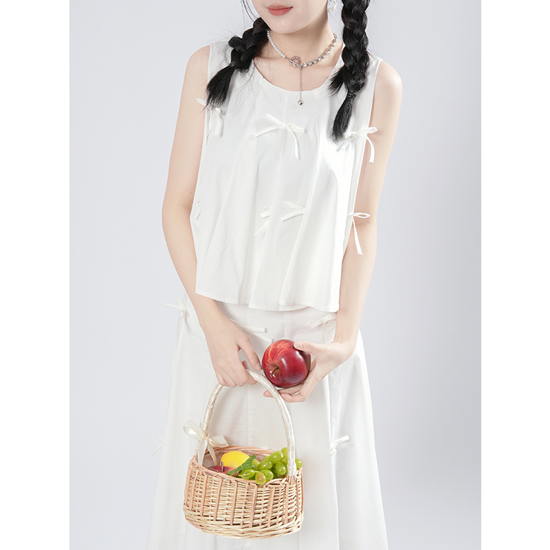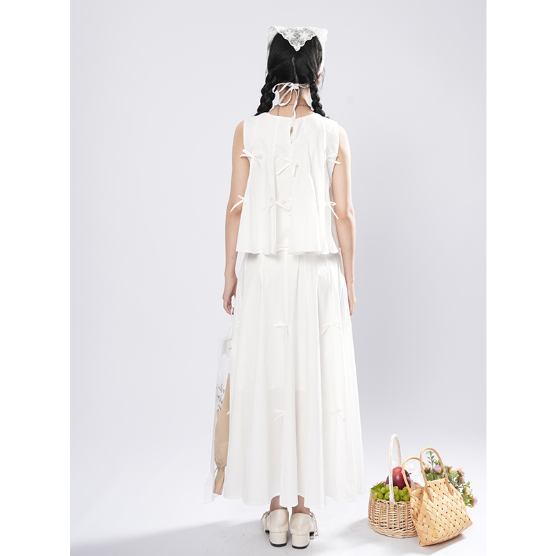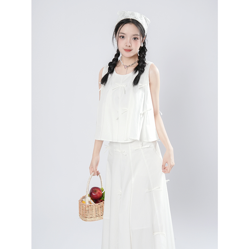 白色百褶蝴蝶结圆领上衣长裙套装裙2025夏季新款小清新休闲两件套