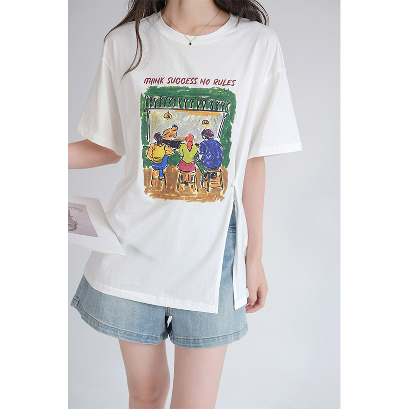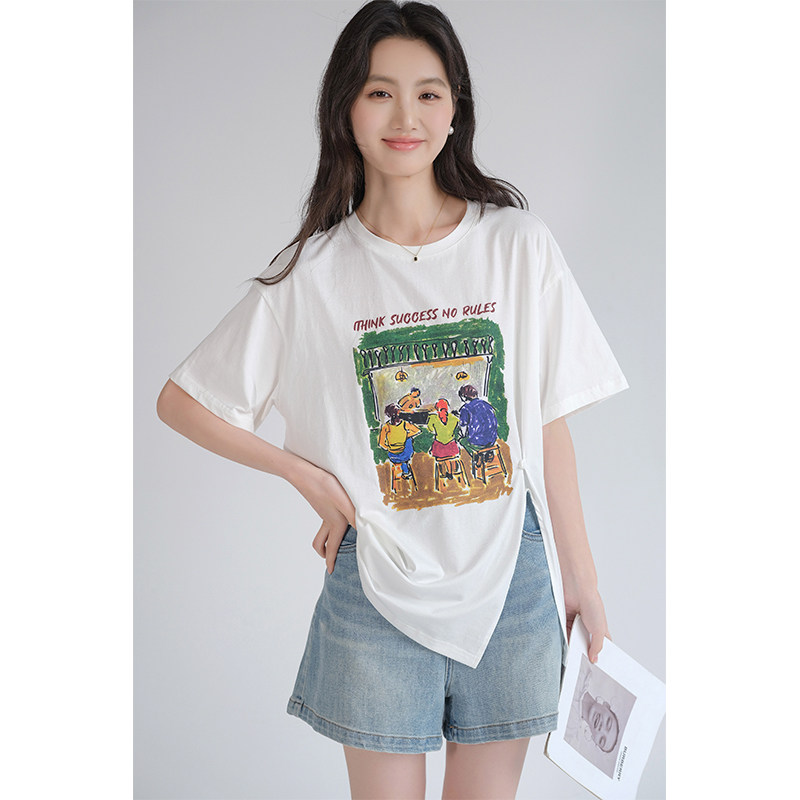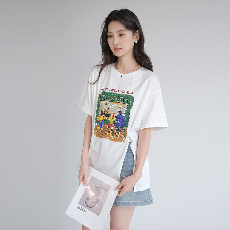 【chic油画印花开衩T恤】蓝若水大码2026夏新款别致宽松韩系上衣