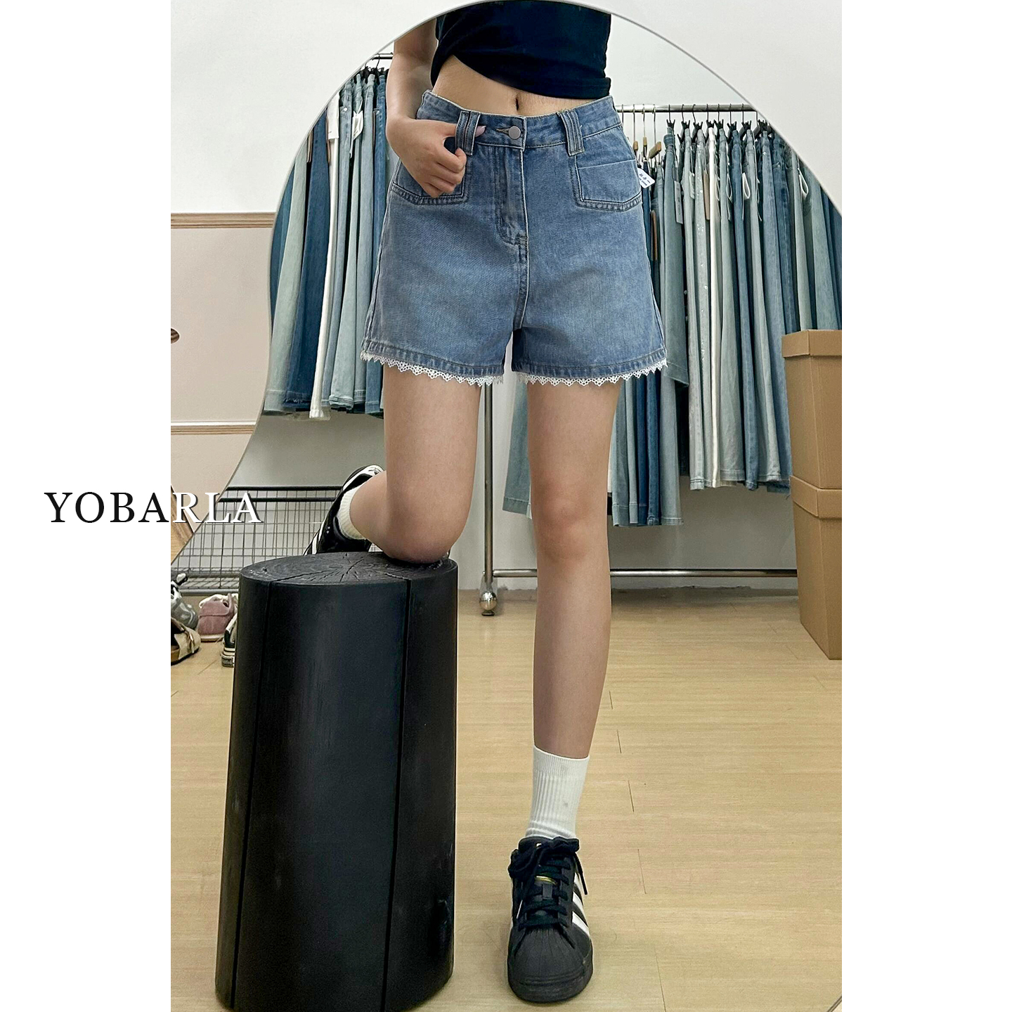 蕾丝花边牛仔短裤女夏薄款大码梨型身材胖mm显瘦高腰a字阔腿热裤