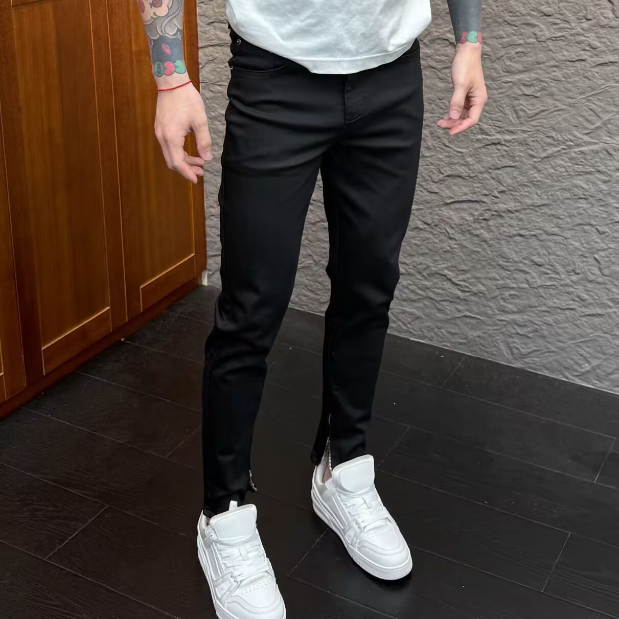 黑色牛仔裤男脚口拉链设计2025秋