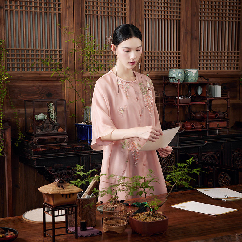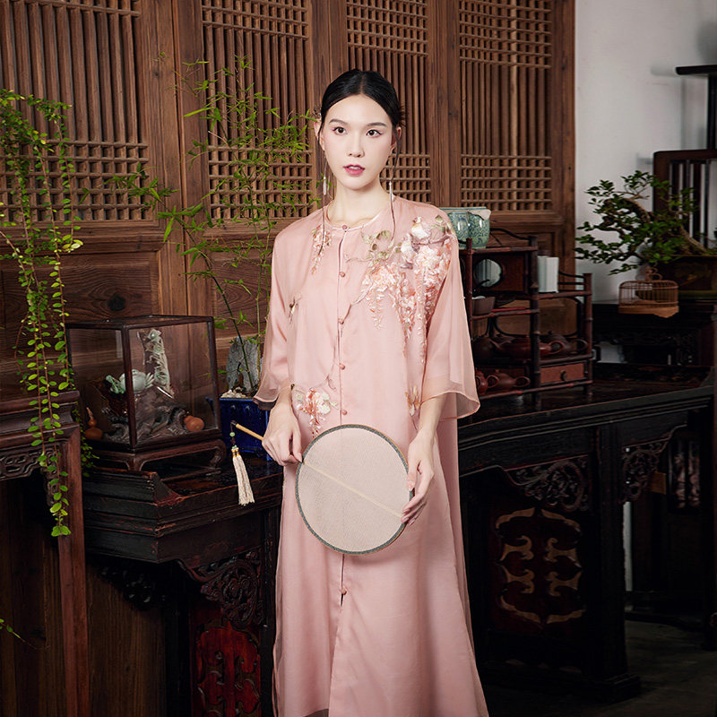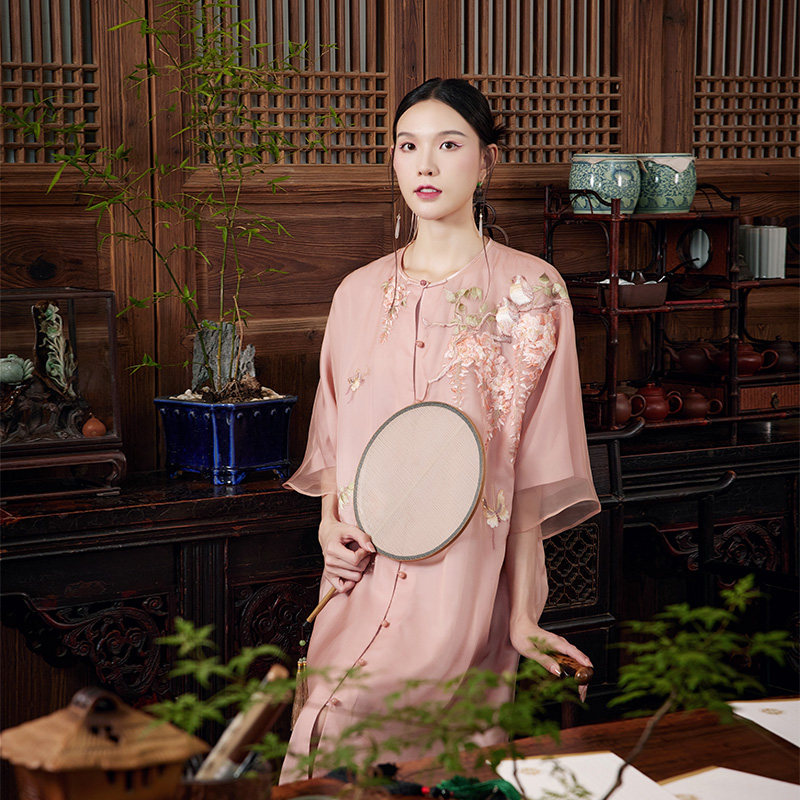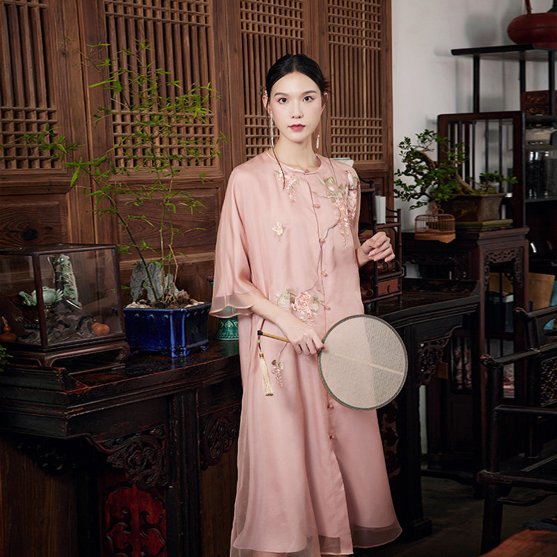 陌遇原创丨舜华丨夏季新款中国风100%桑蚕丝绣花中开襟旗袍连衣裙