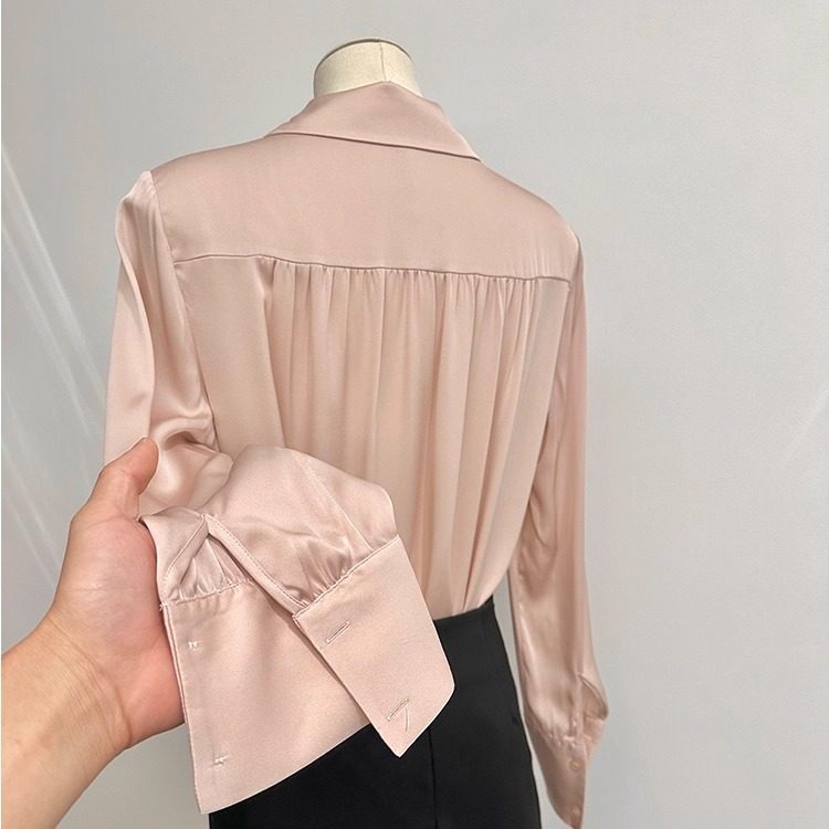 法式轻奢压褶职场通勤重磅桑蚕丝双乔缎面纯色长袖翻领真丝衬衫女