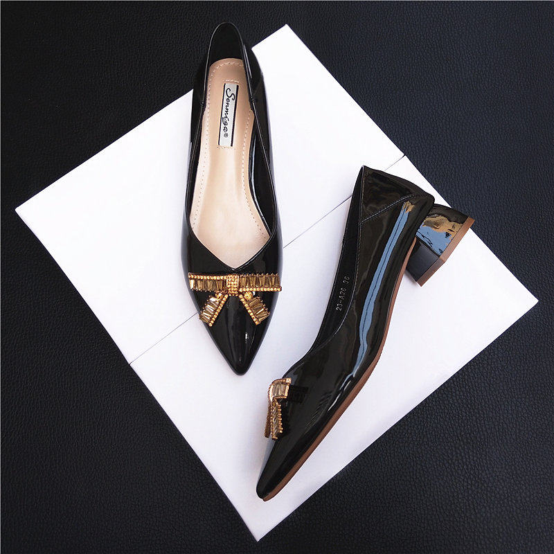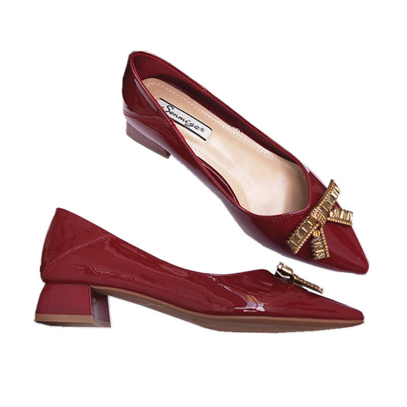粗跟单鞋女中跟2024春新款百搭尖头平底鞋时尚瓢鞋钻扣新娘红婚鞋