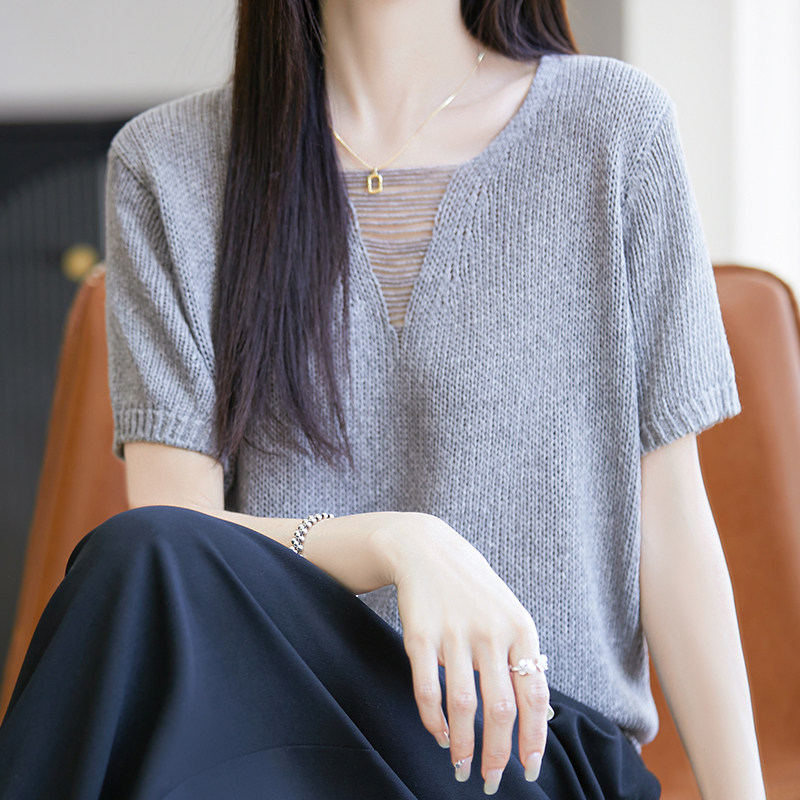 v领天丝亚麻针织短袖t恤打底上衣
