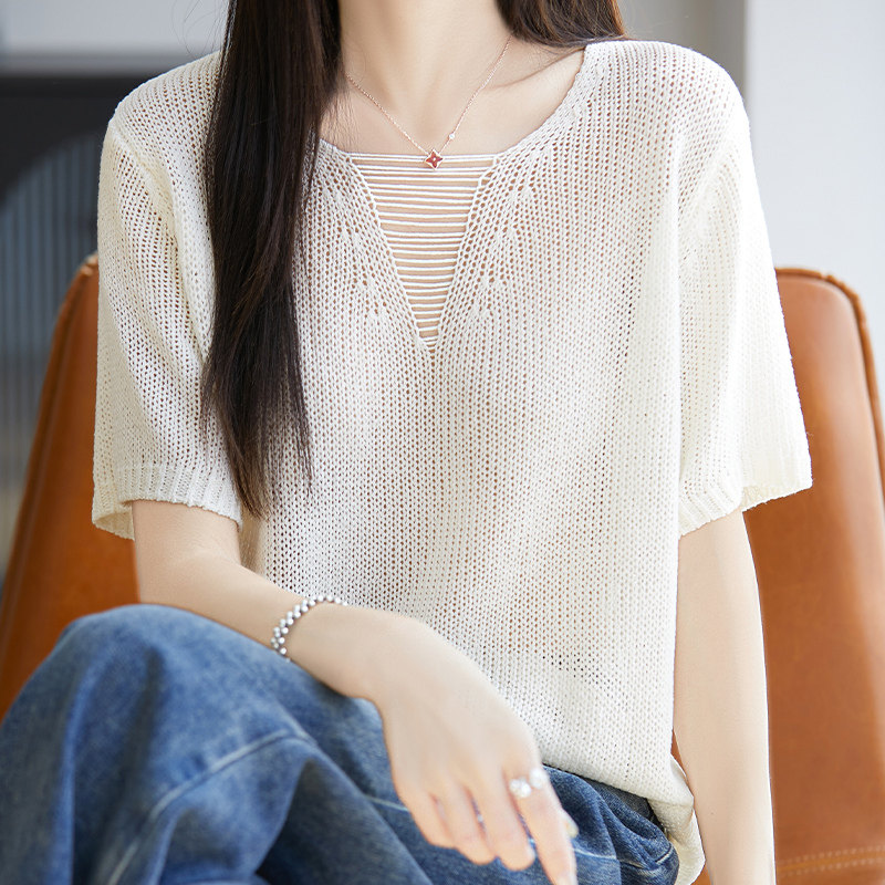 夏季v领天丝亚麻针织短袖t恤女宽松镂空显瘦套头半袖打底纯色上衣