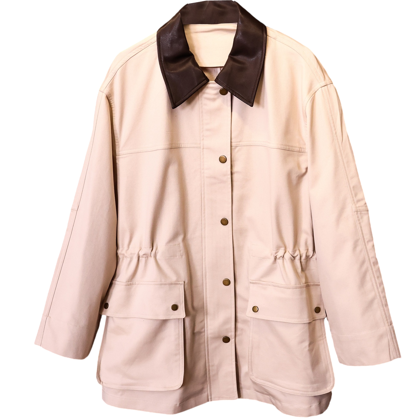 巴恩风撞色拼皮领大口袋中长款外套2025秋季新款长袖女装风衣V649