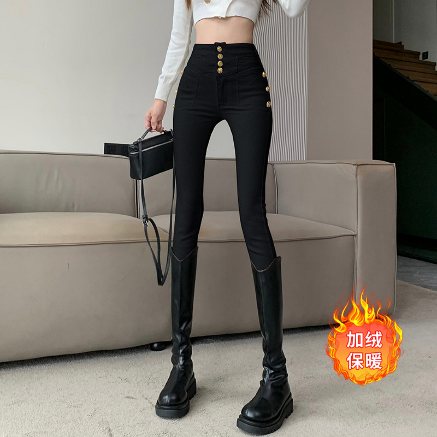 排扣抓绒高腰显瘦小脚牛仔裤女