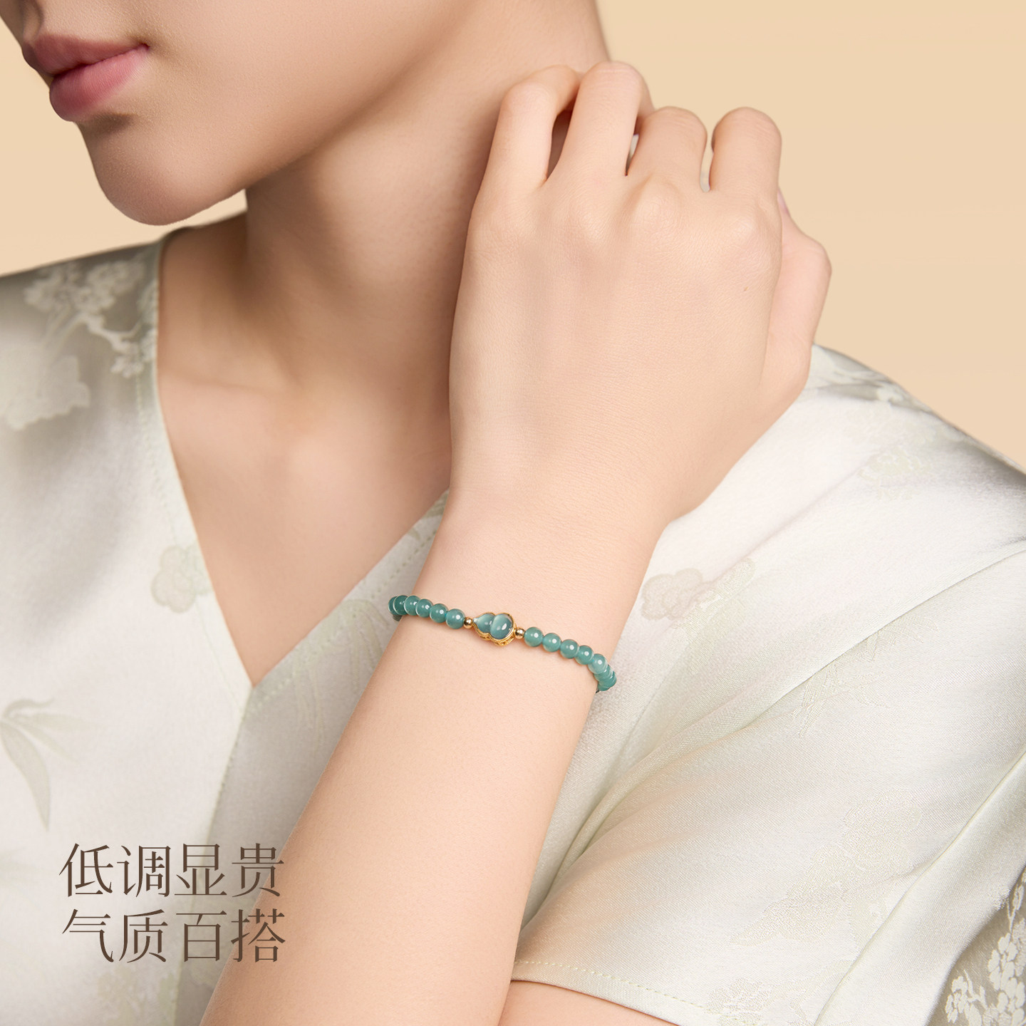 庆祥泰天然蓝水翡翠手串女款冰种葫芦转运珠足金圆珠子饰品手链