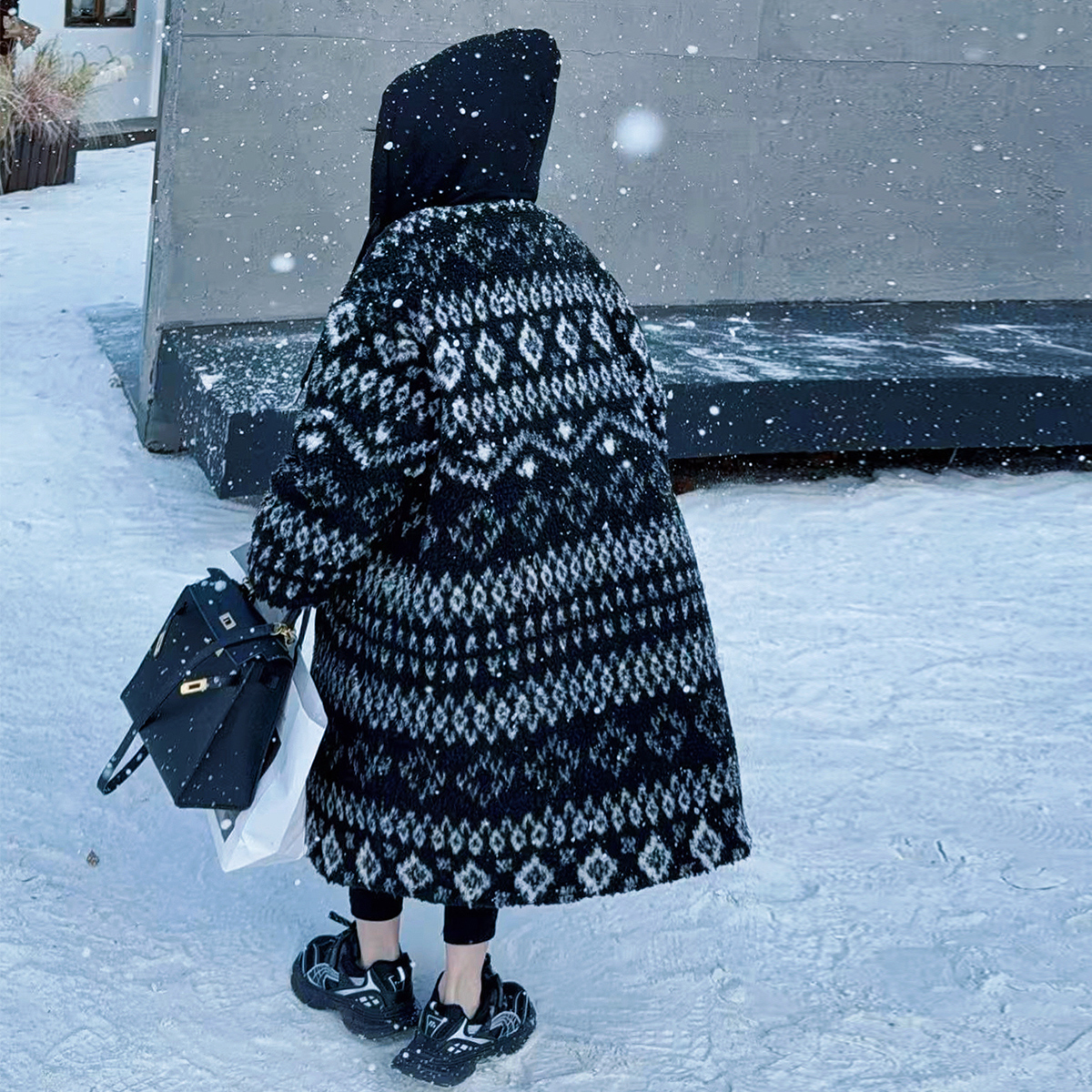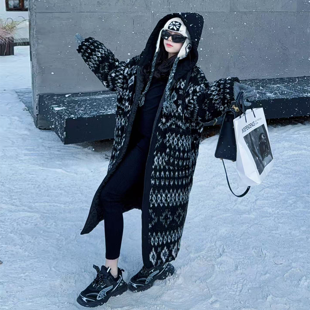欧货连帽长款针织棉服外套女童2025冬季新款印花毛衣保暖棉外套