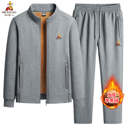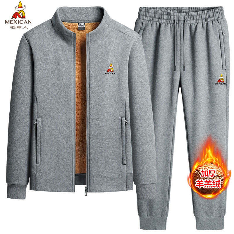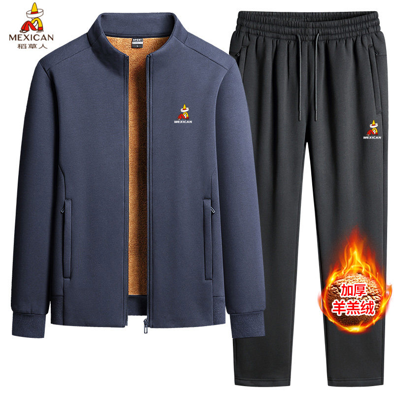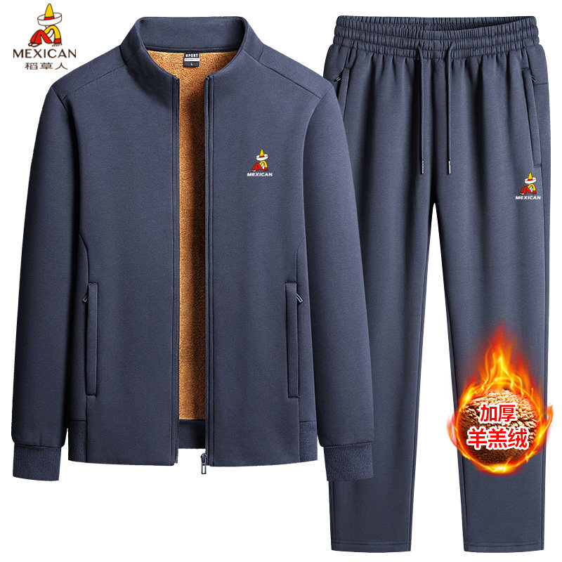 稻草人中老年男士立领羊羔绒冬季加厚套装爸爸保暖休闲运动服套装