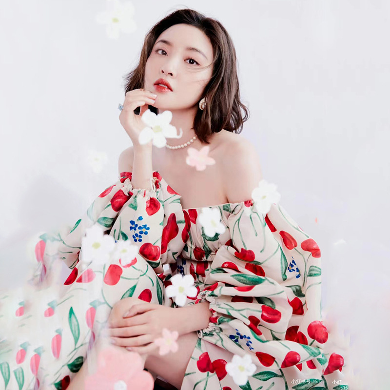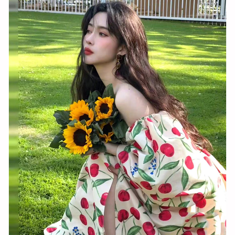 [现货]2024夏季唐艺昕孟子义同款连衣裙一字肩灯笼袖开叉抹胸长裙