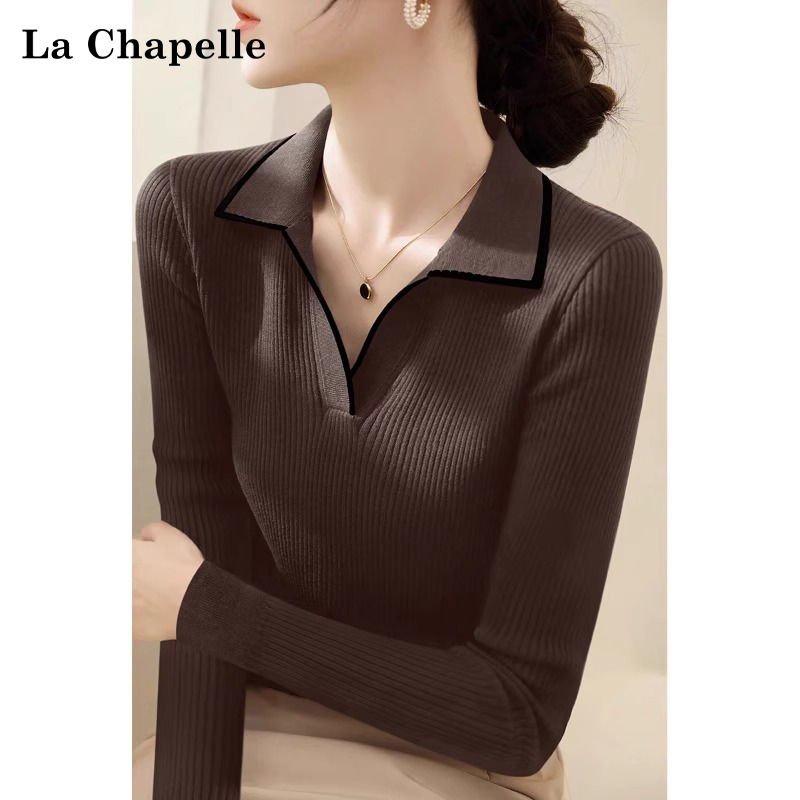 拉夏贝尔黑色POLO领针织衫女春季修身内搭打底衫拼色时尚长袖上衣