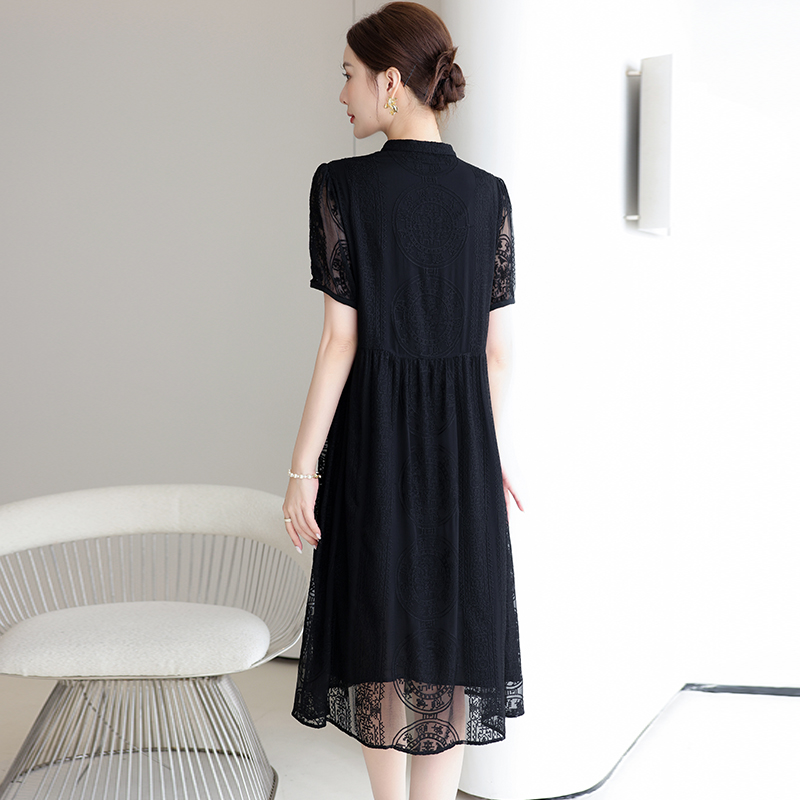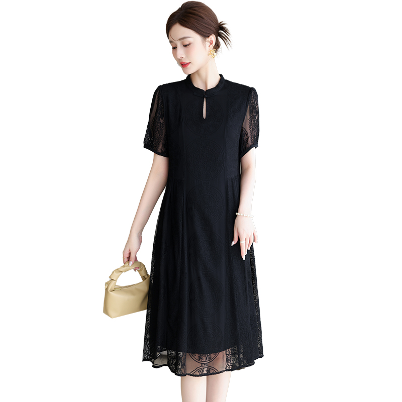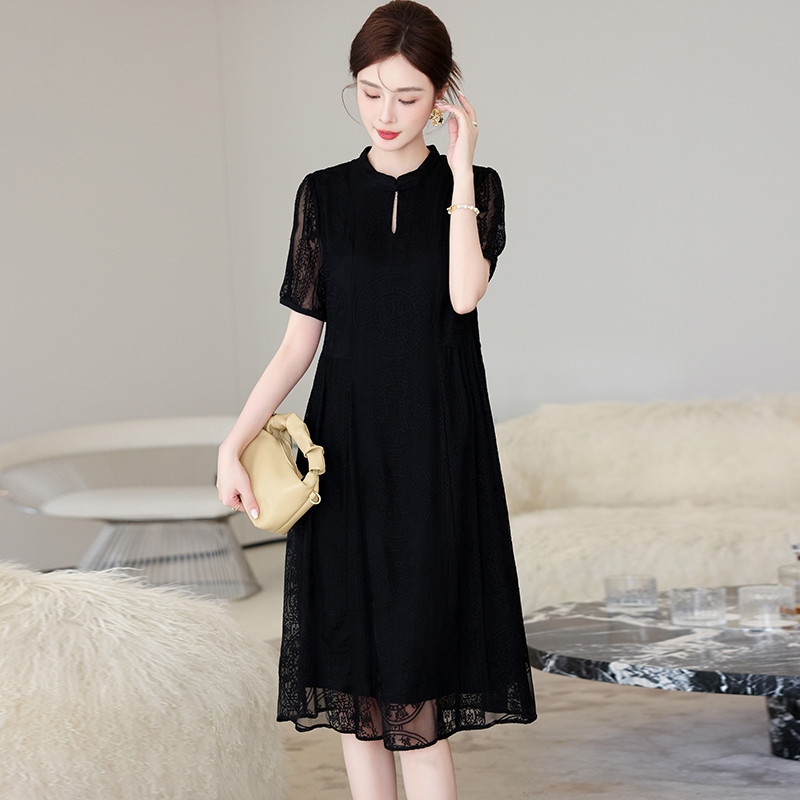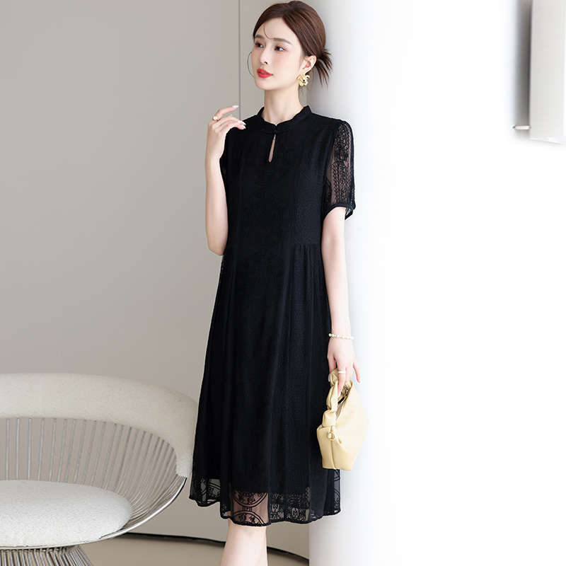 新款真丝连衣裙女时尚桑蚕丝精致立领刺绣收腰气质洋气裙子夏季