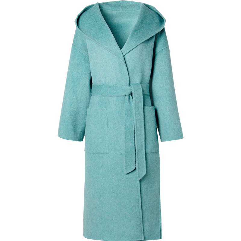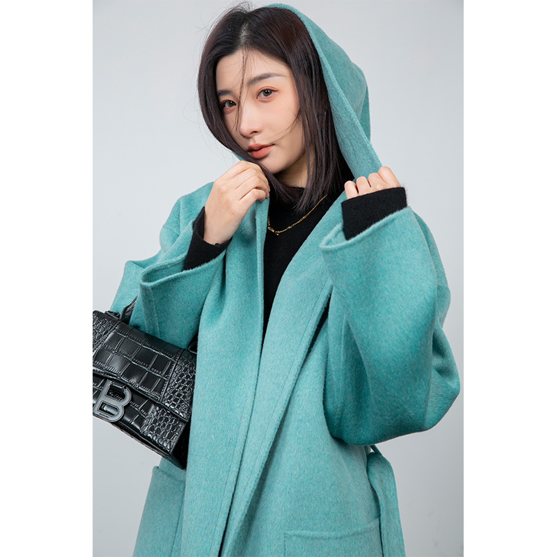 竹依依湖蓝色双面羊绒大衣女长款过膝高级感高端连帽纯羊毛呢外套