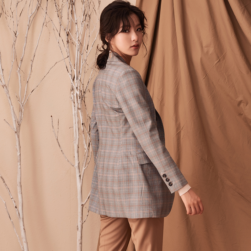 罗衣通勤职业西装中长外套女2025秋装新款知性OL修带格子西服5656