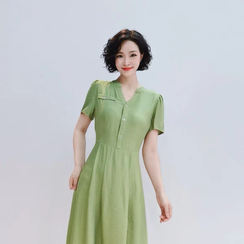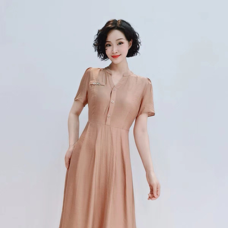 4131 夏季时尚简约轻奢纯色V领显瘦气质连衣裙