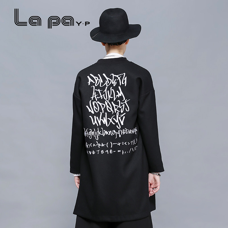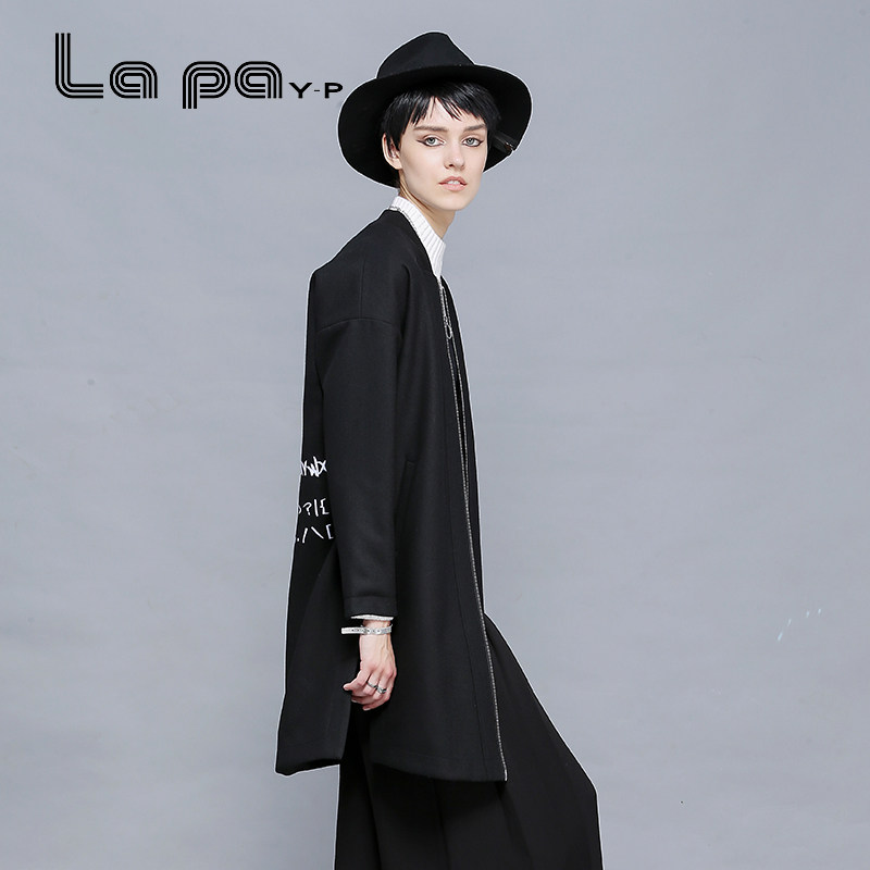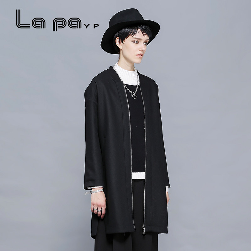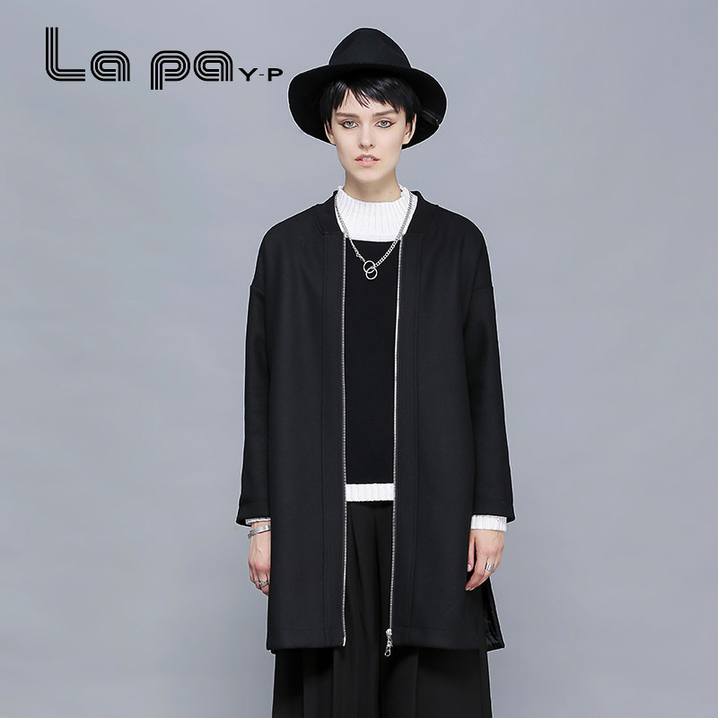 lapa秋冬装黑色毛呢外套中长款