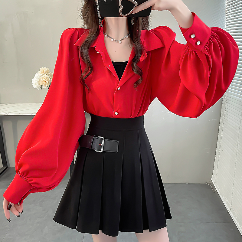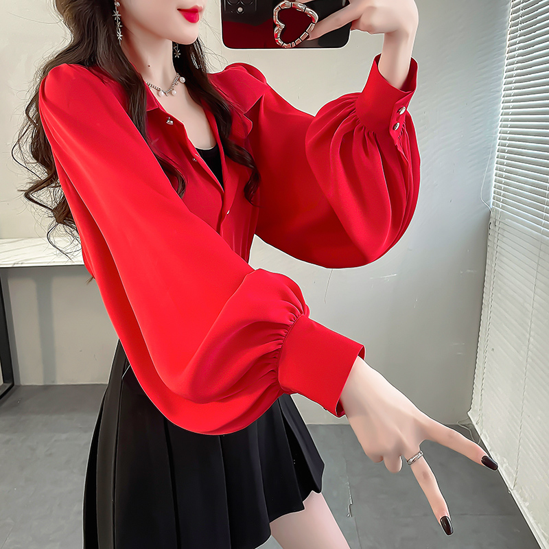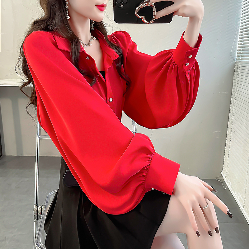 2025年春季雪纺翻领衬衫设计感高级红色衬衣显瘦时尚灯笼袖上衣女