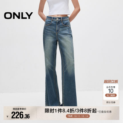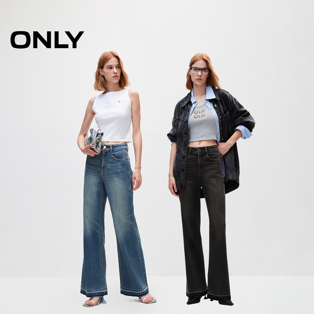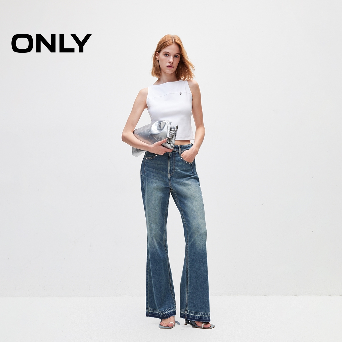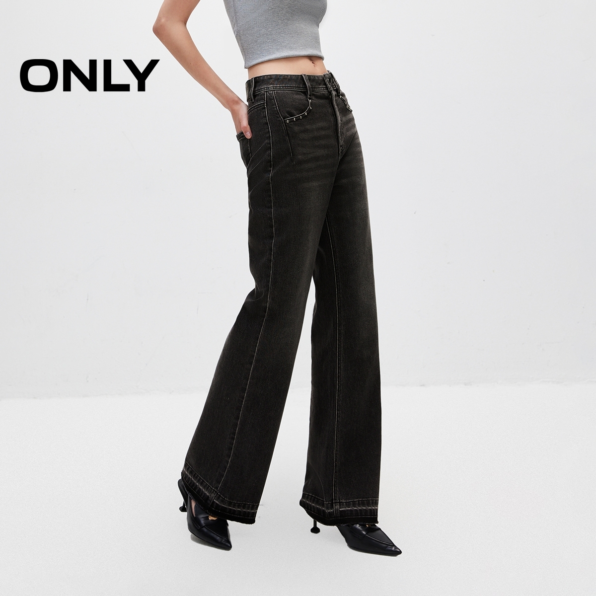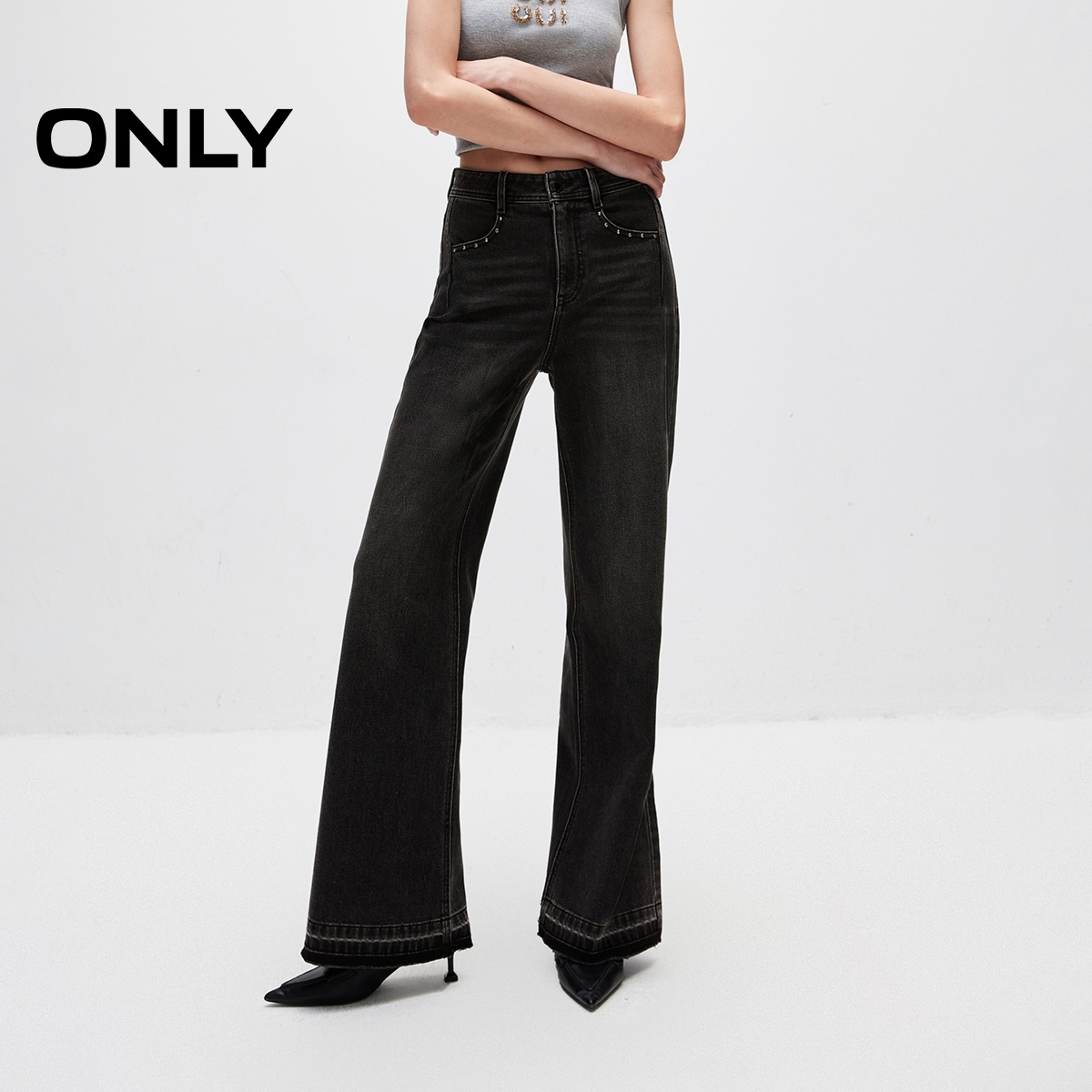 【ONLY奥莱】秋季显瘦高腰重工镶钻毛边喇叭裤牛仔裤女