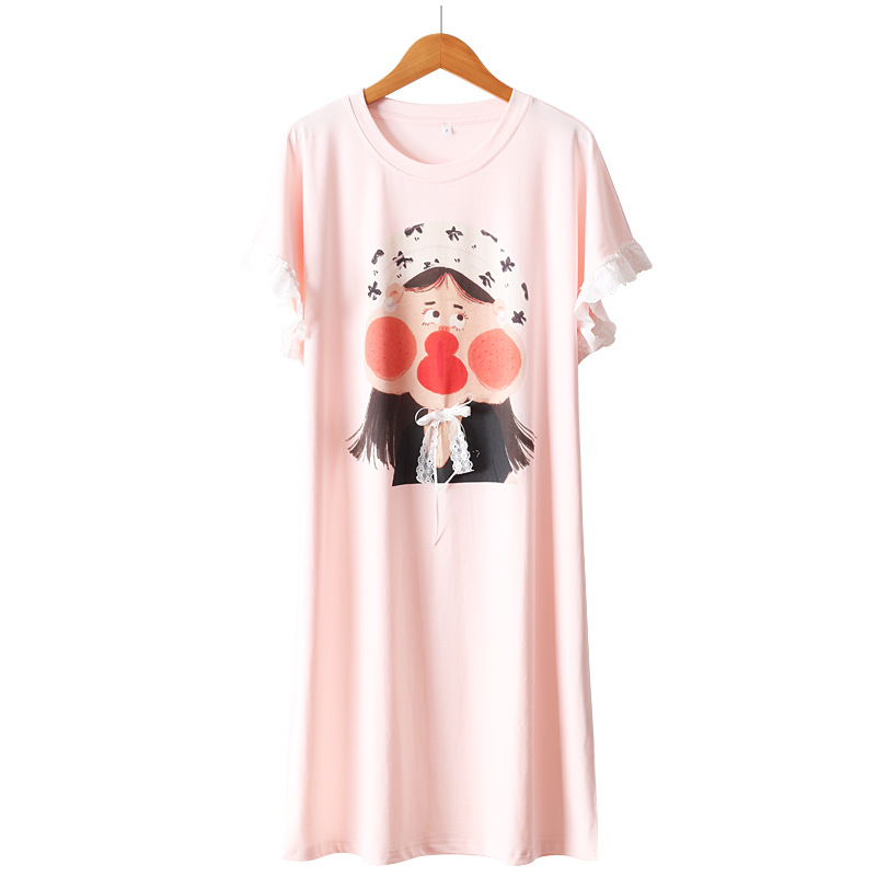 卡通女孩花边宽松睡裙韩版甜美纯棉薄款短袖夏季女INS网红家居服