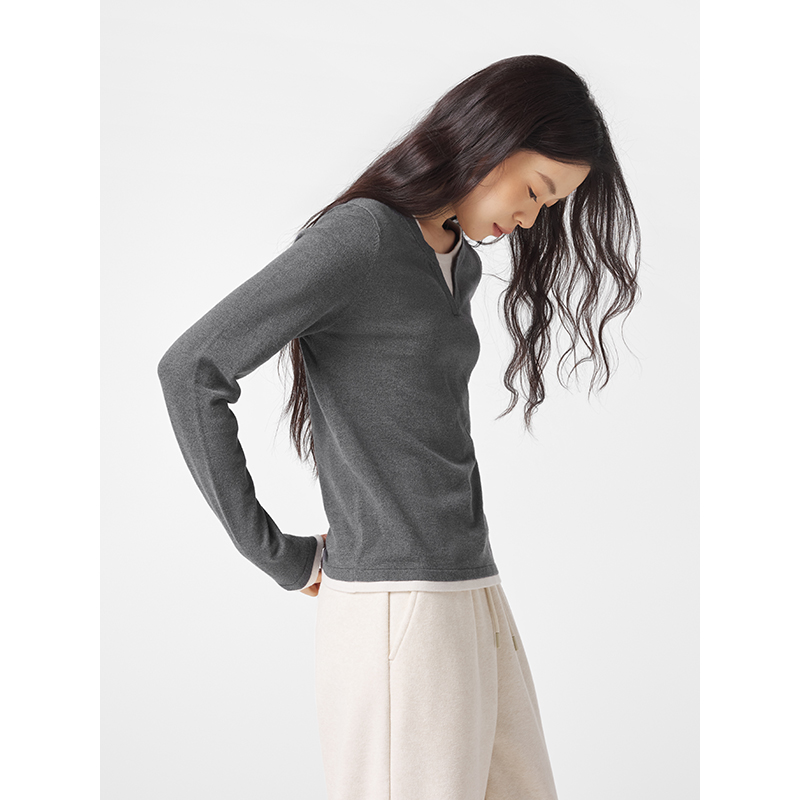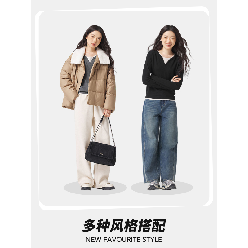 热风2025年冬季新款女士开春穿搭拼色假两件低圆领套头针织衫上衣
