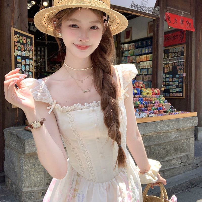 Acaine粉色长款方领收腰泡泡袖a字吊带连衣裙女夏季法式复古裙子