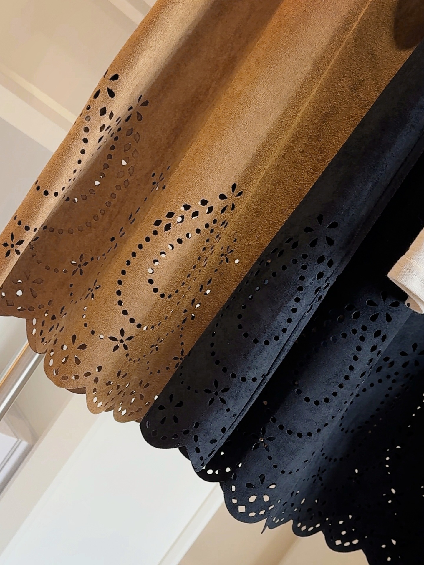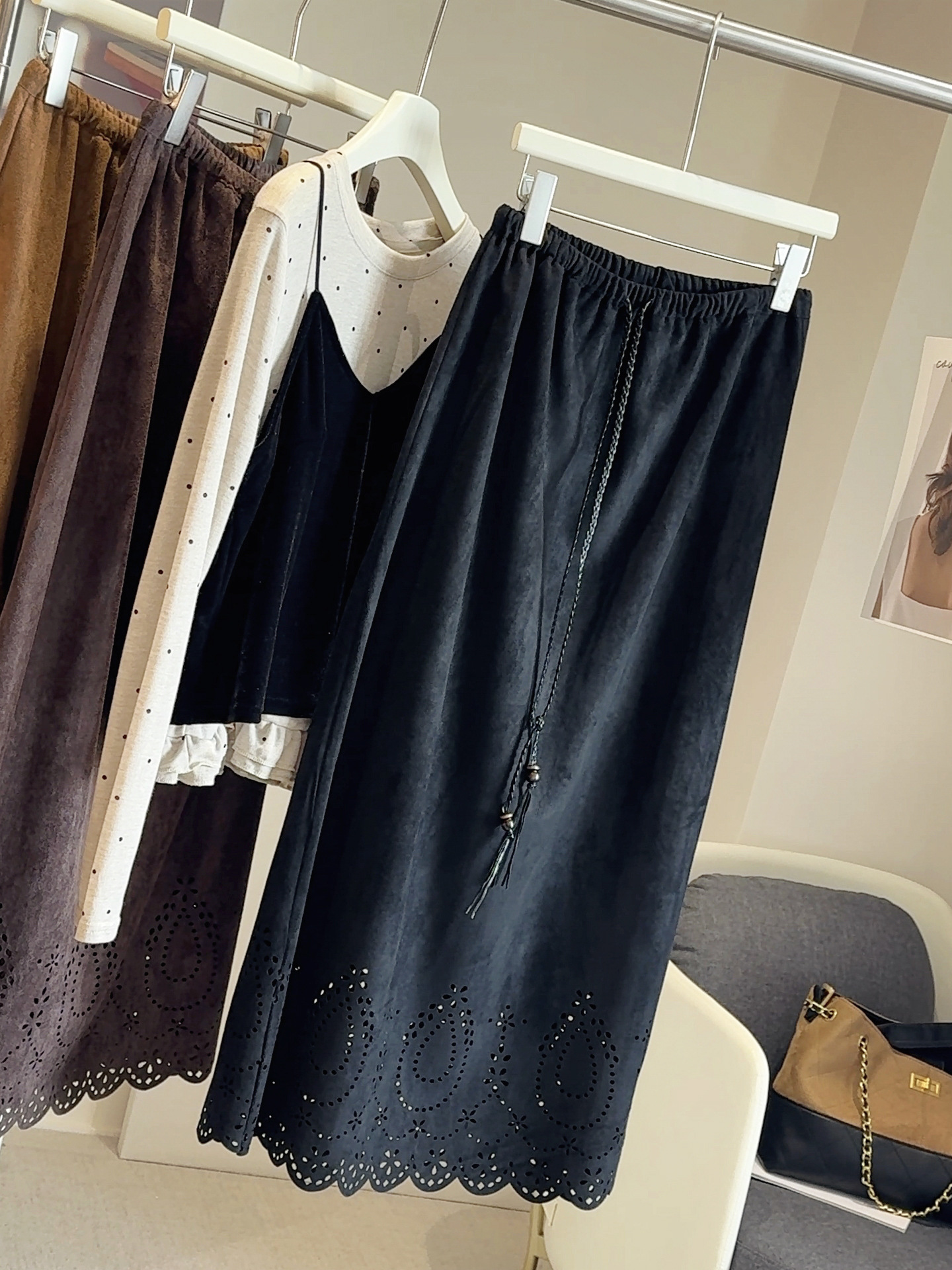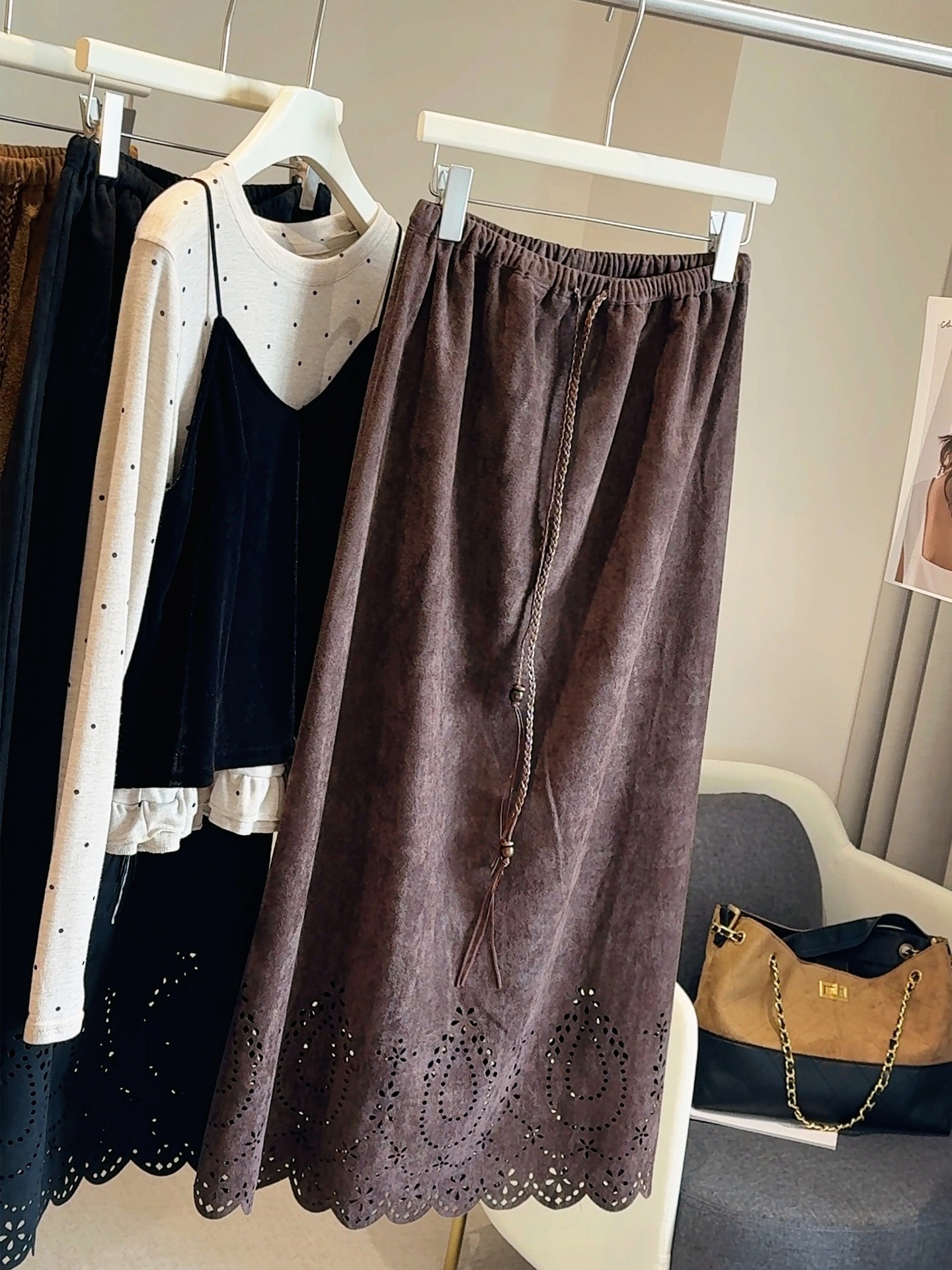 设计感镂空麂皮绒半身裙女秋冬复古抽绳松紧腰百搭a字中长裙子