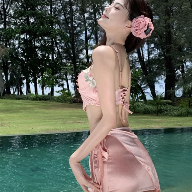 源头工厂2024新款日韩分体比基尼大小胸钢托聚拢保守三件套泳衣女