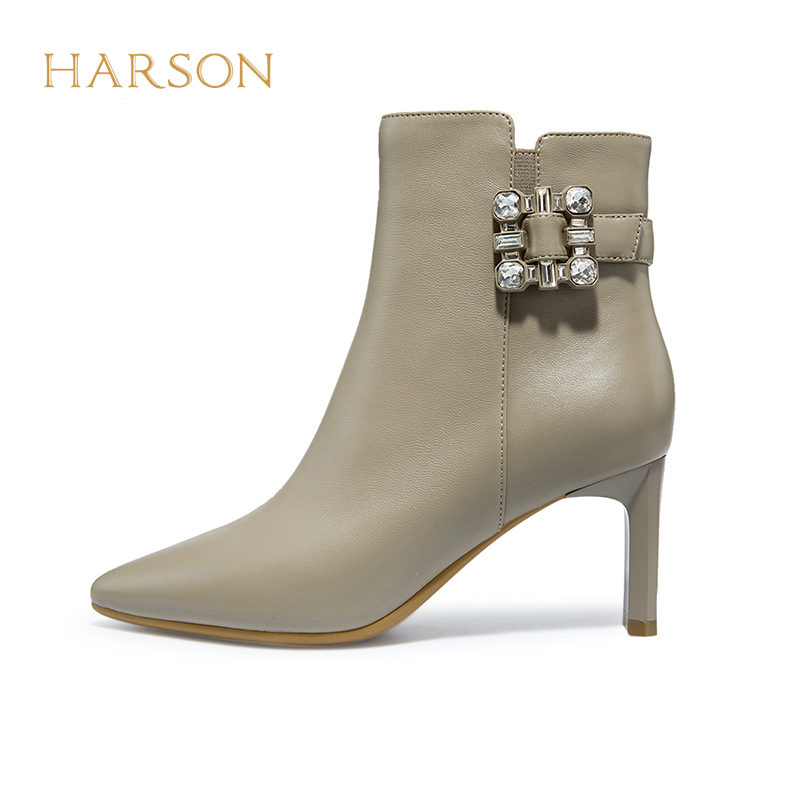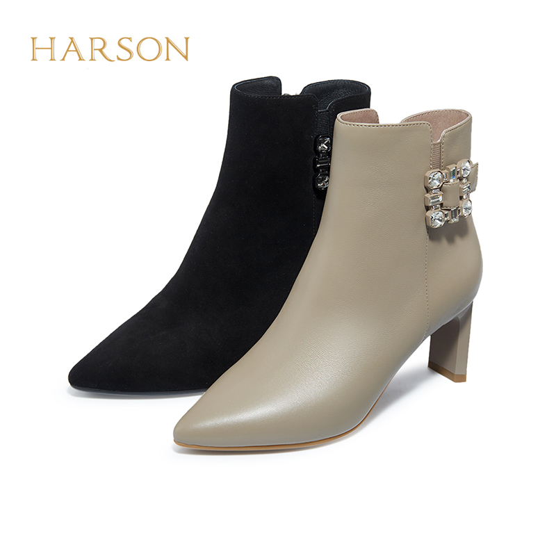 哈森尖头粗高跟时装短靴女秋冬新款羊皮侧拉链短筒女靴 HA227175