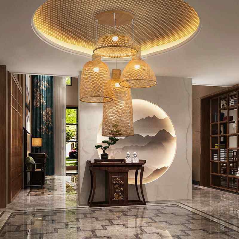 竹编组合吊灯创意个性中式装饰餐厅大厅茶室民宿复式楼梯三头灯具